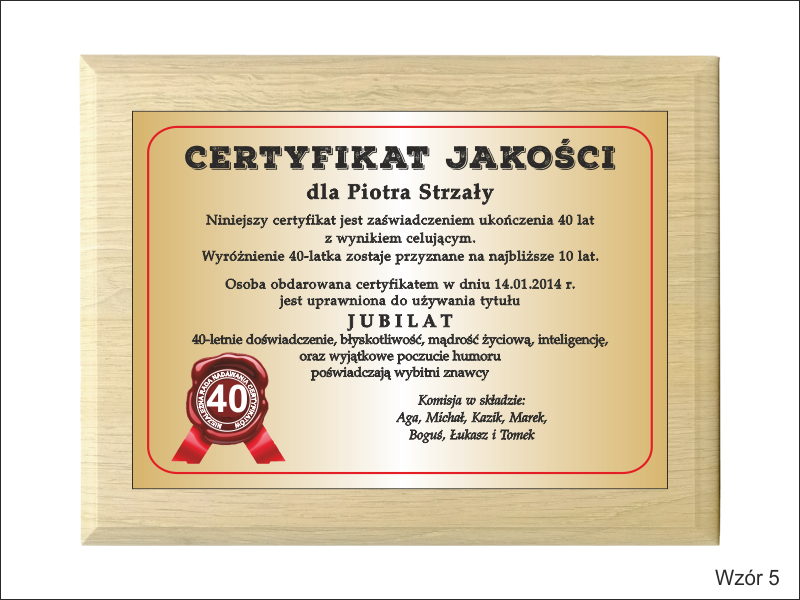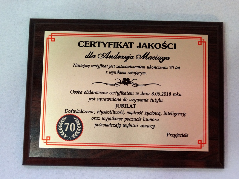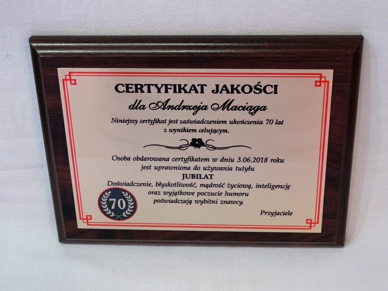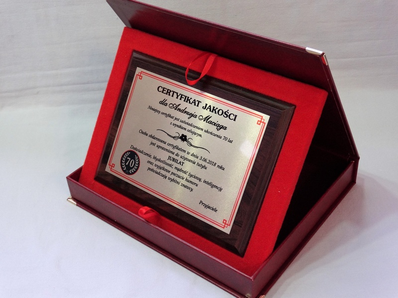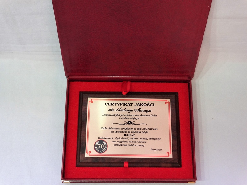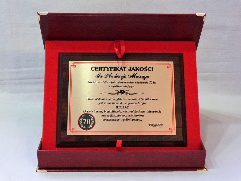 Drewniany dyplom jako okolicznościowy certyfikat urodzinowy na standardowym drewnianym podkładzie.