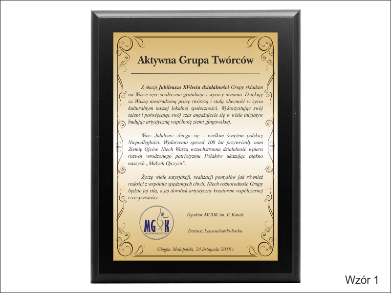 Dedykacja, grafiki, herby czy loga wykonane są.na blaszce w złotym lub srebrnym odcieniu.
