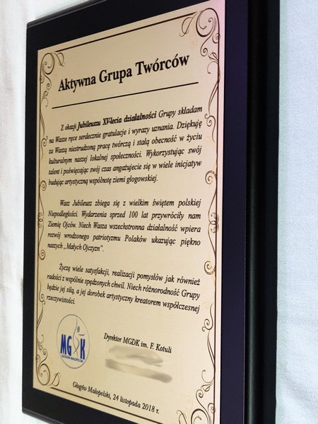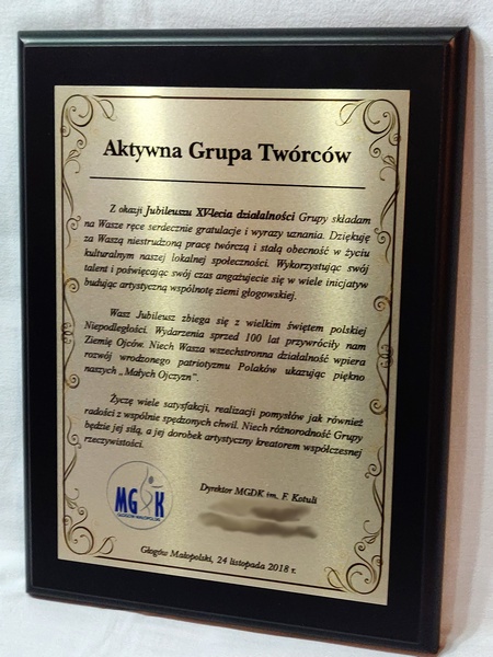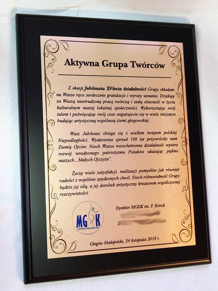 Dyplom drewniany na lakierowanym podkładzie z nadrukowaną blachą z okazji jubileuszu funkcjonowania stowarzyszenia.