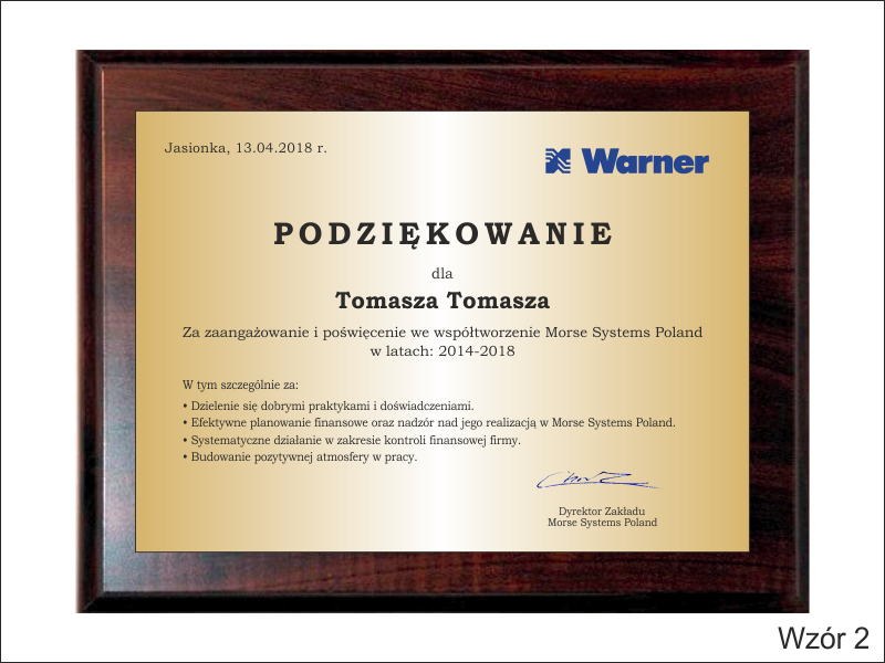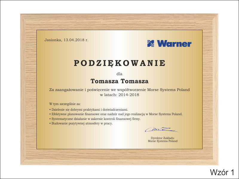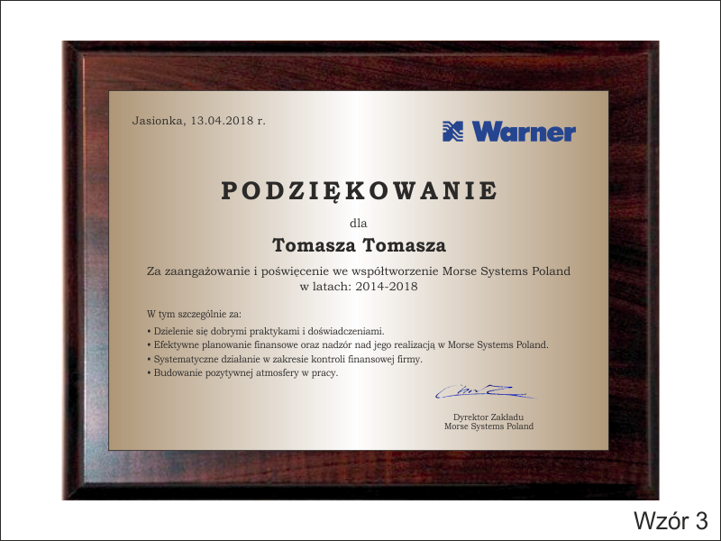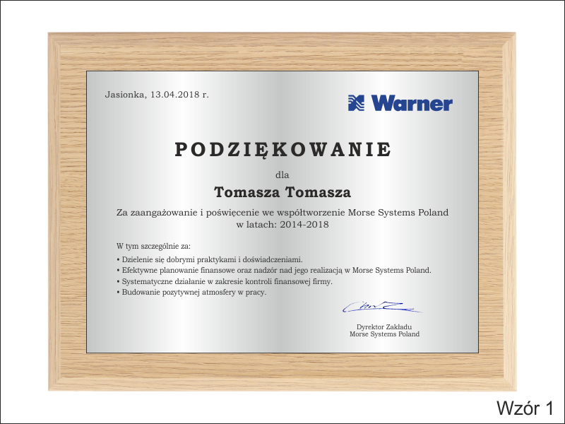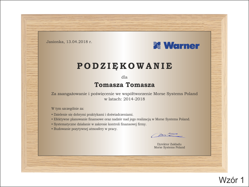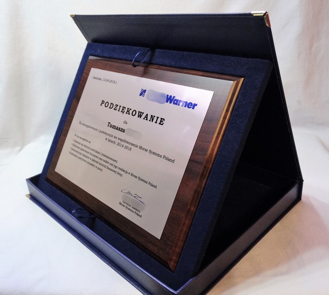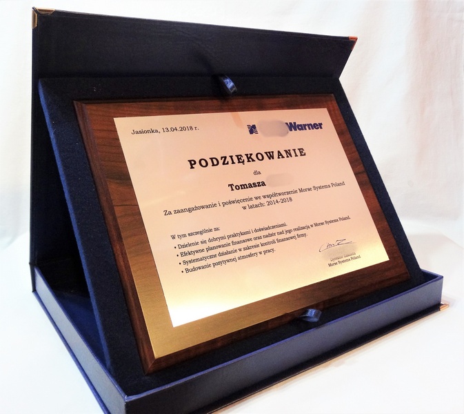 Drewniany dyplom okolicznościowy jako podziękowanie za pracę na drewnianym standardowym podkładzie z blachą z nadrukiem.