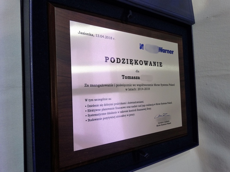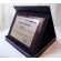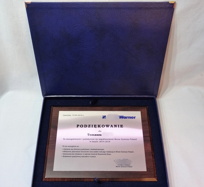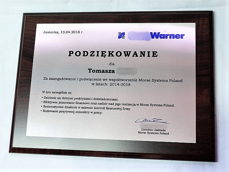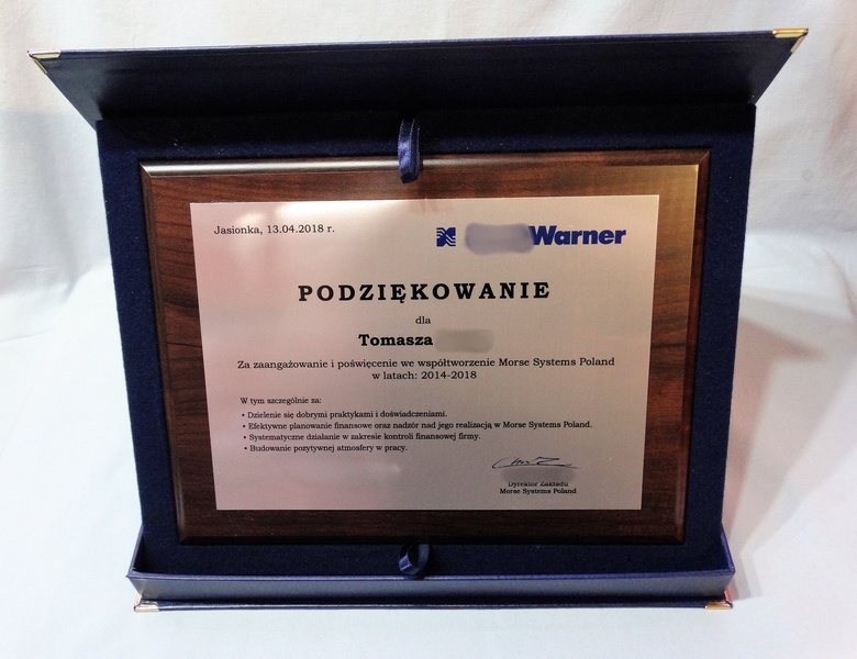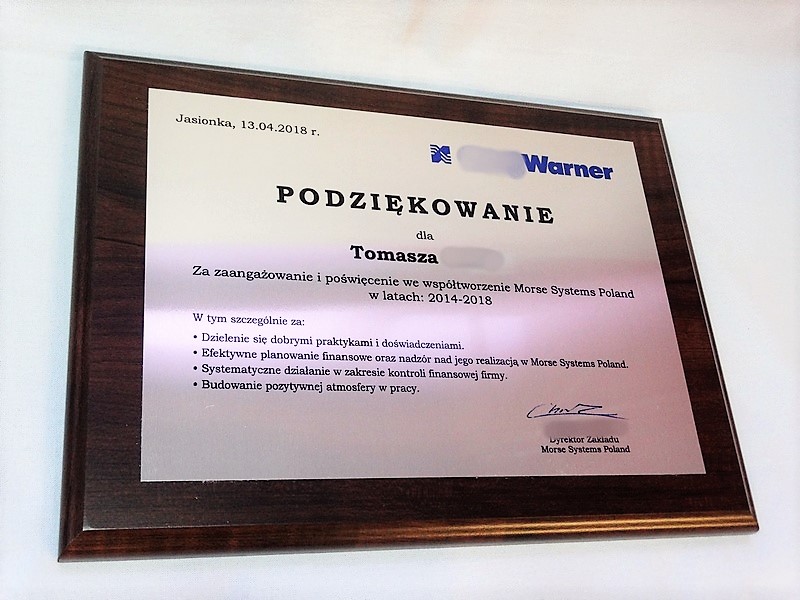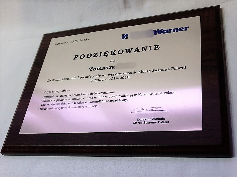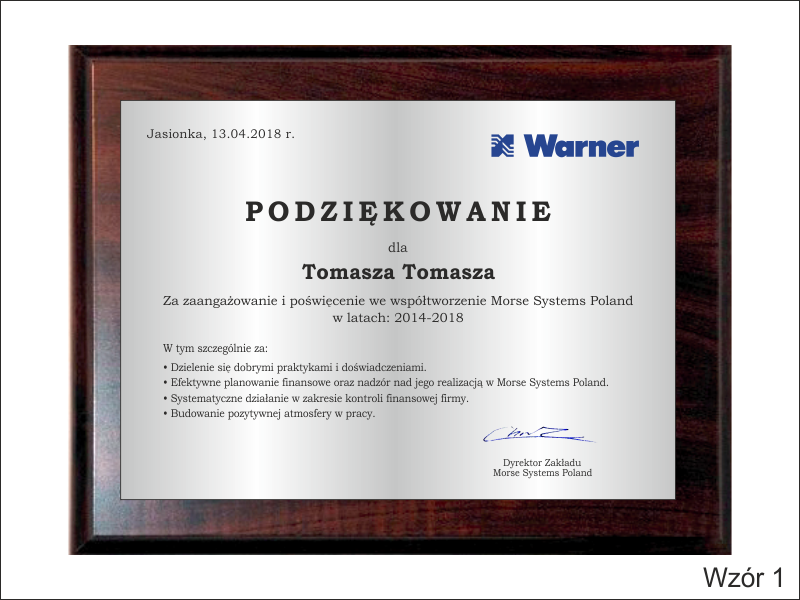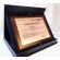 Drewniany dyplom okolicznościowy jako podziękowanie za pracę na drewnianym standardowym podkładzie z blachą z nadrukiem.