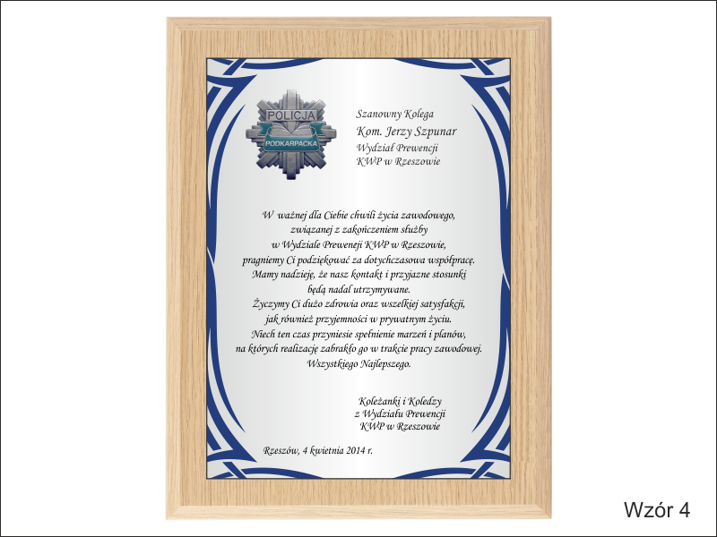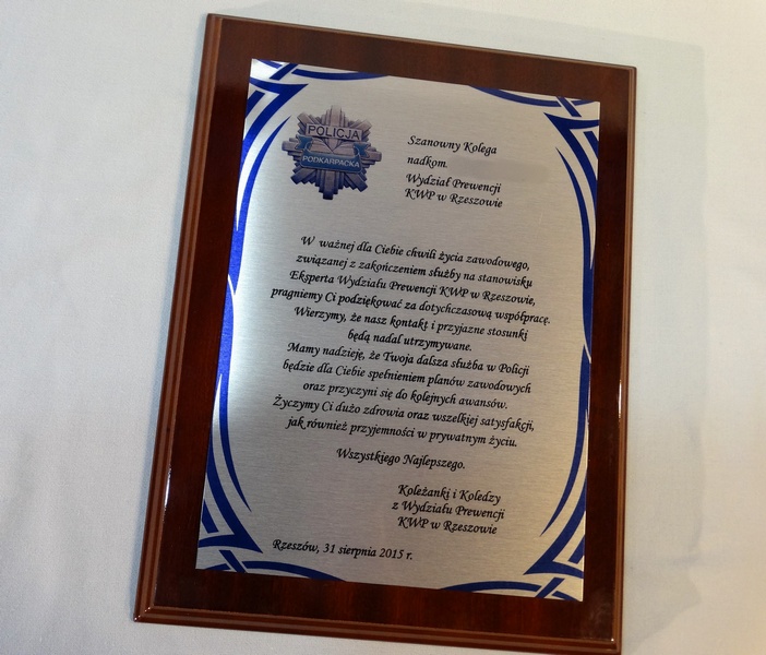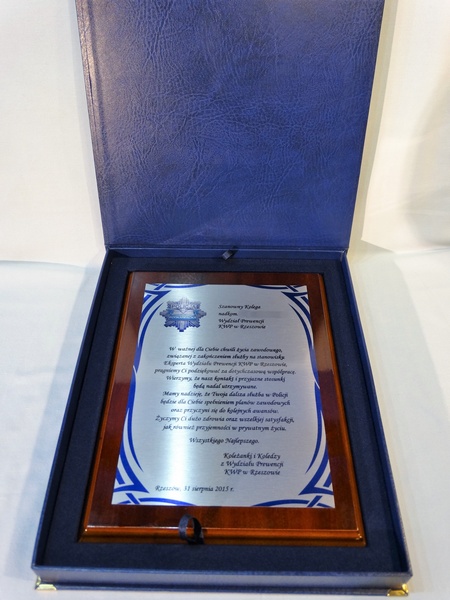 Dyplom drewniany z blachą z nadrukiem na standardowym podkładzie, na pamiątkę wspólnej służby.