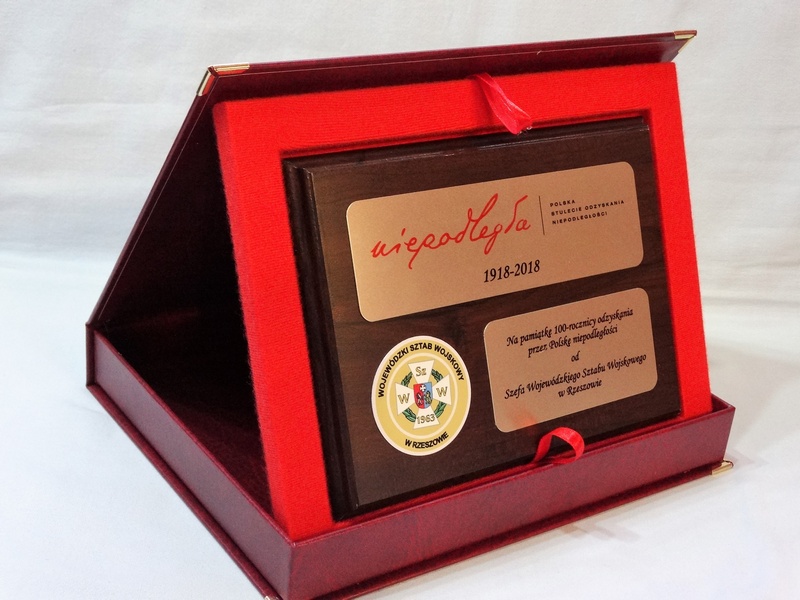 Dyplom drewniany w postaci pamiątkowego okolicznościowego Ryngrafu.