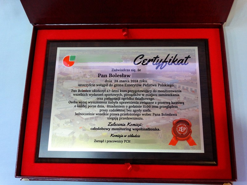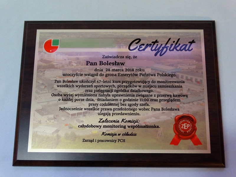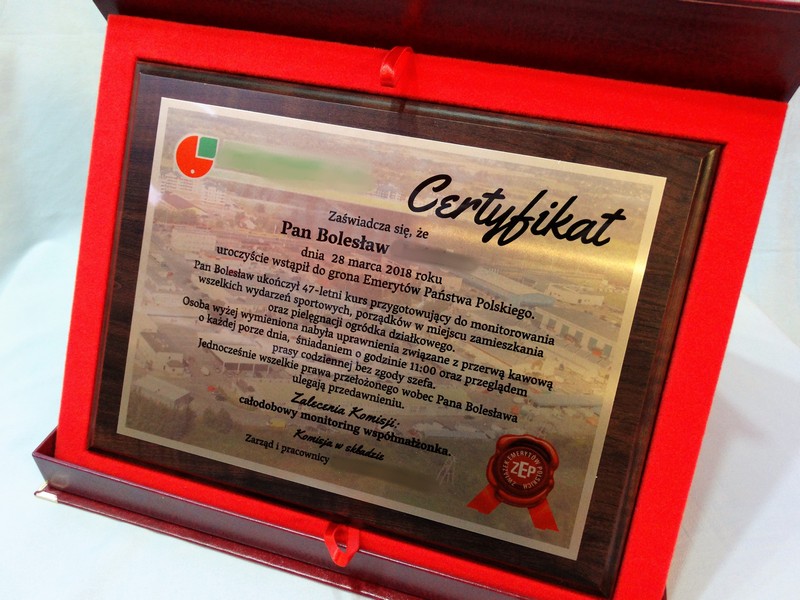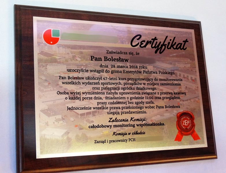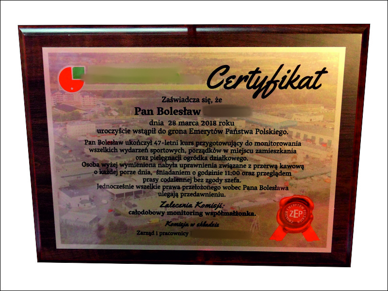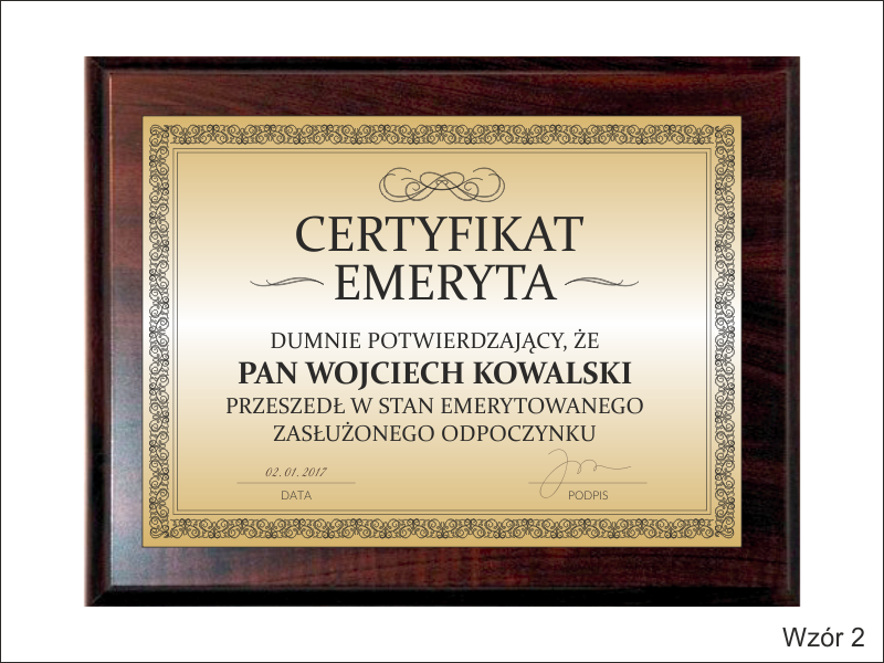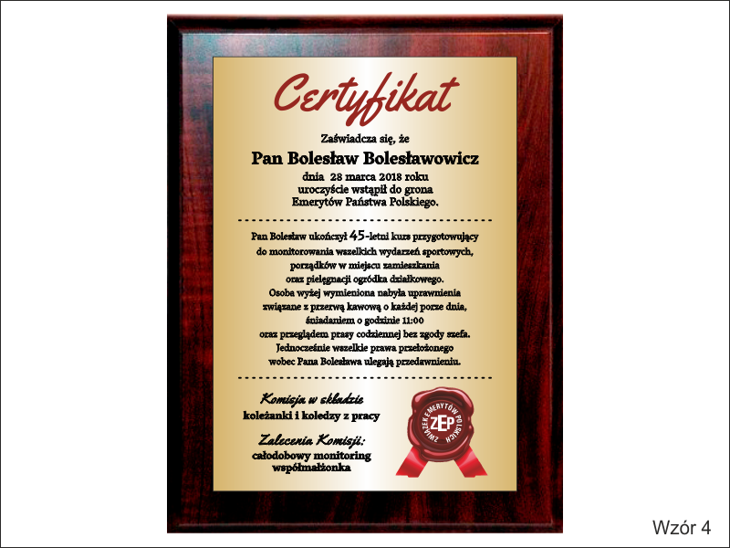 Prezentowany dyplom dedykowany jest jako certyfikat emeryta, ale można wykonać go też na inną okoliczność.