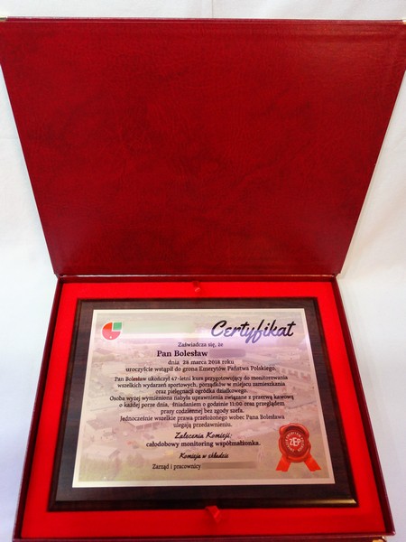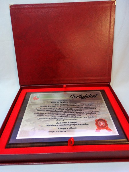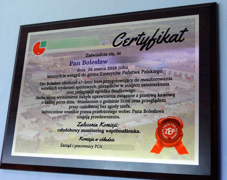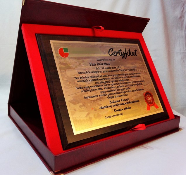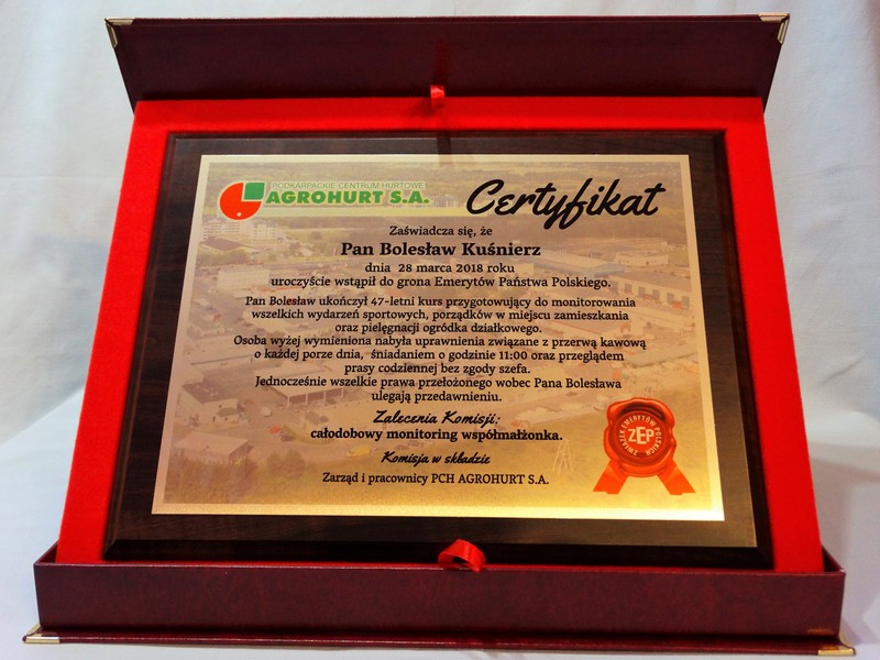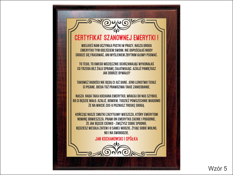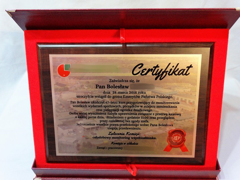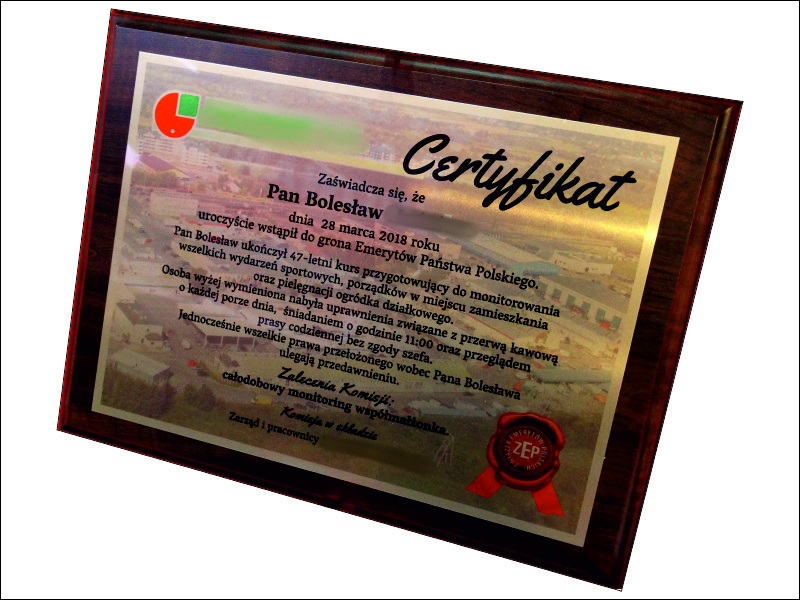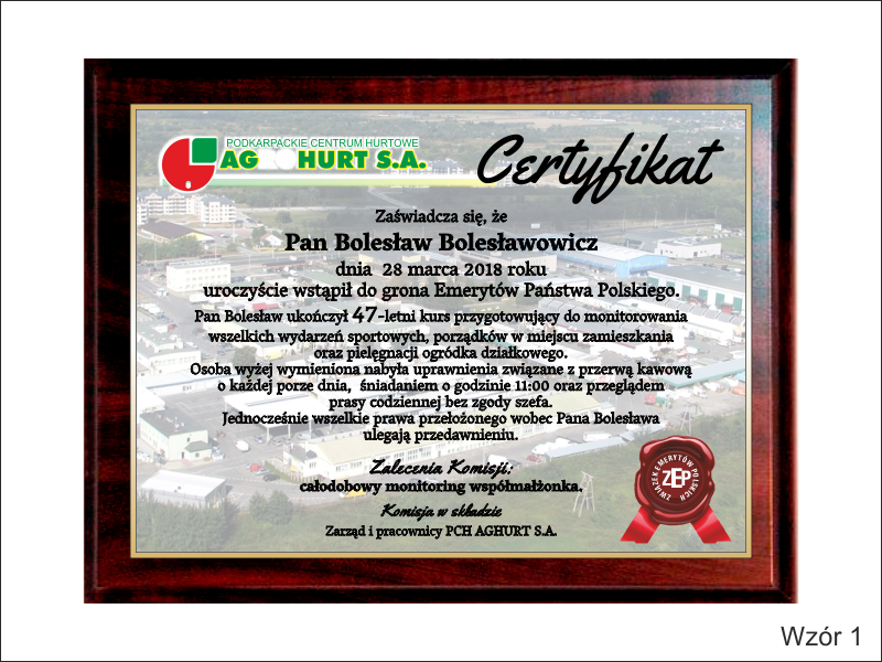 Prezentowany dyplom dedykowany jest jako certyfikat emeryta, ale można wykonać go też na inną okoliczność.