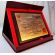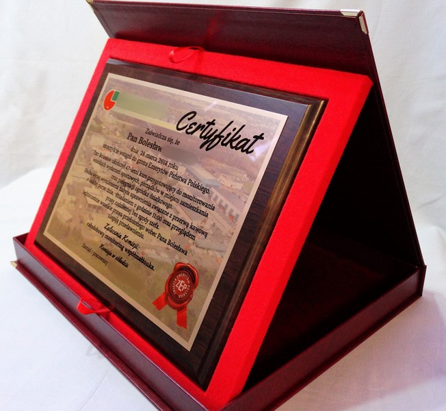 Dyplom okolicznościowy na drewnianym standardowym podkładzie ze złotą blaszką z nadrukiem.