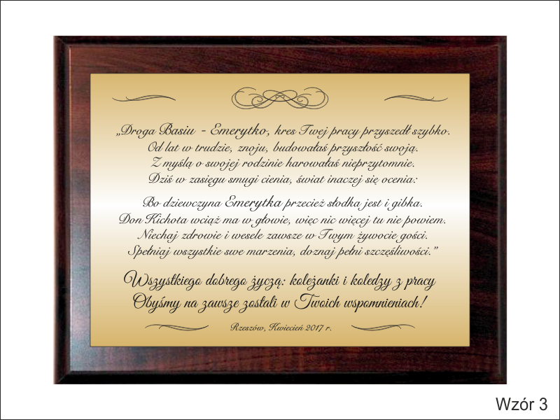 Dedykacja, grafiki, zdjęcia oraz logotypy nadrukowane są na złotej półmatowej aluminiowej blaszce.