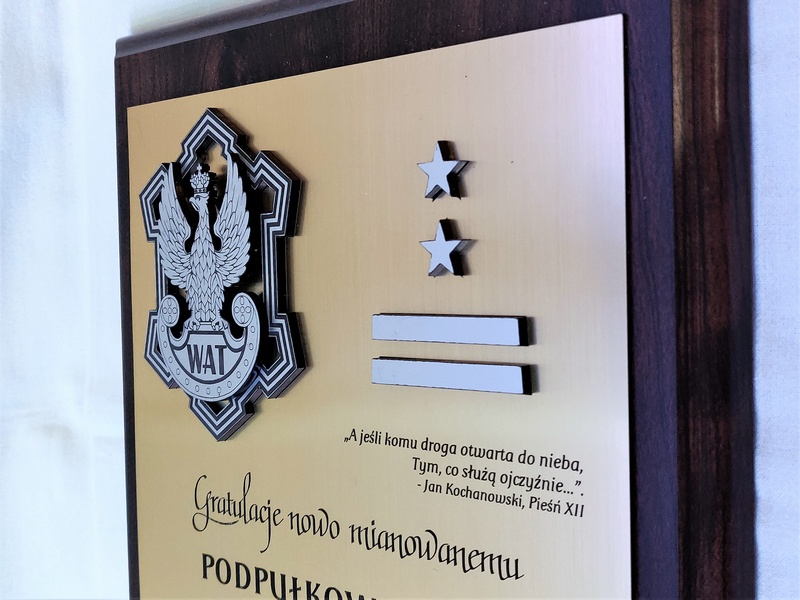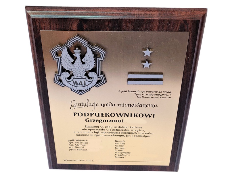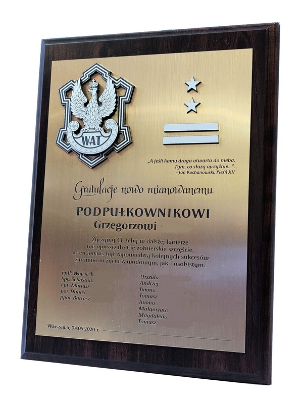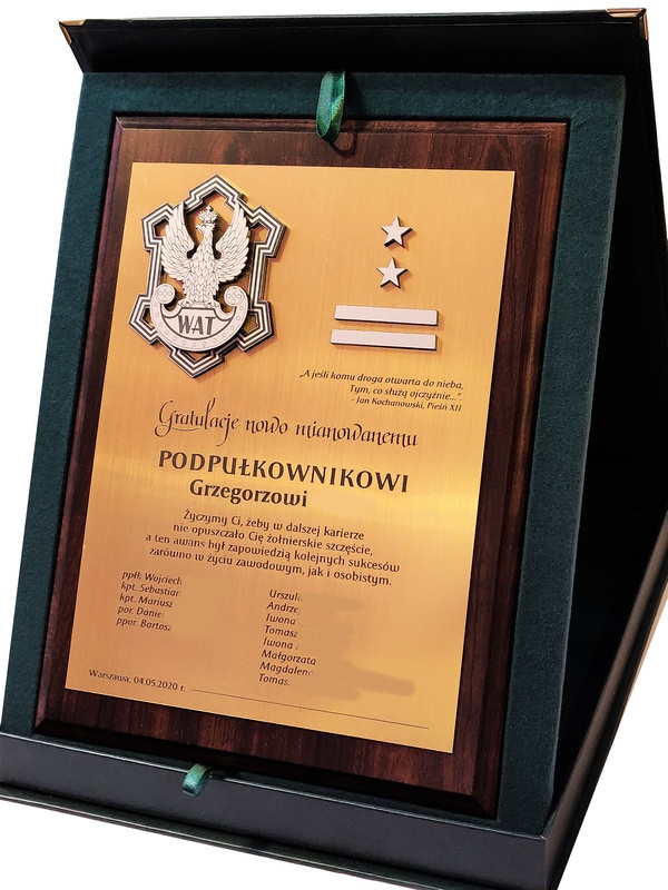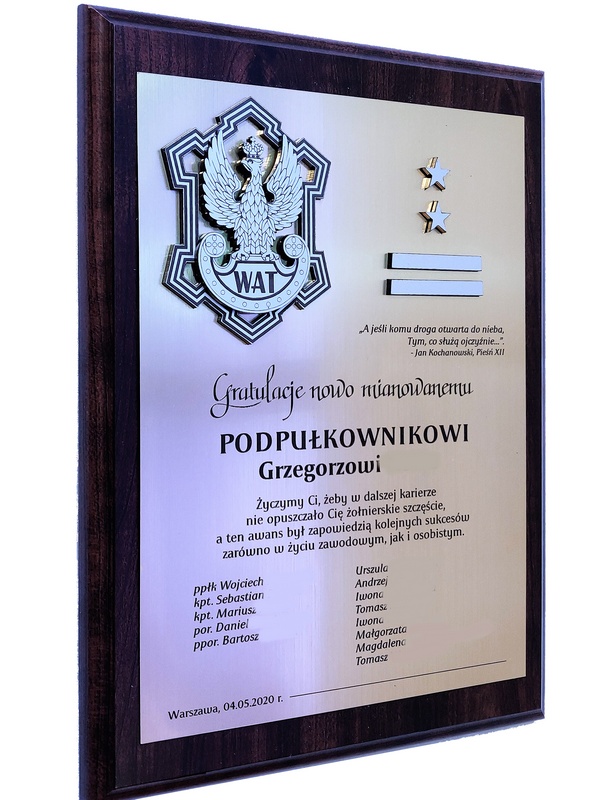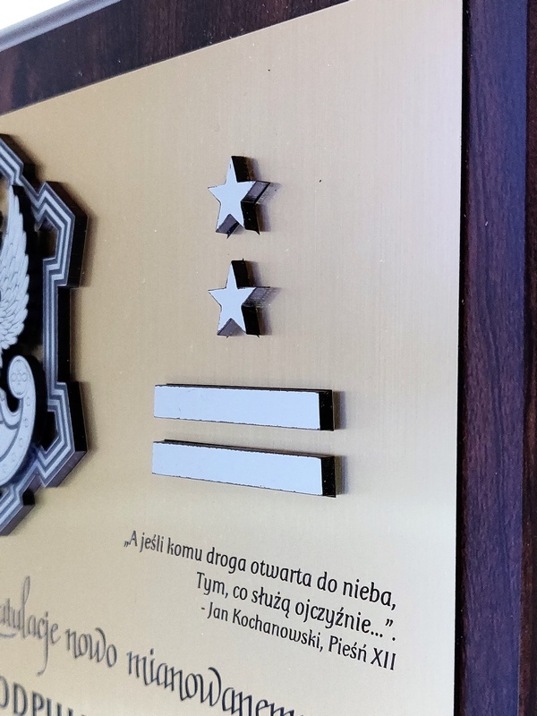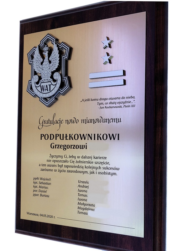 Dyplom drewniany grawerowany złożony, wykonany na standardowym podkładzie jako gratulacje z okazji awansu na wyższy stopień.