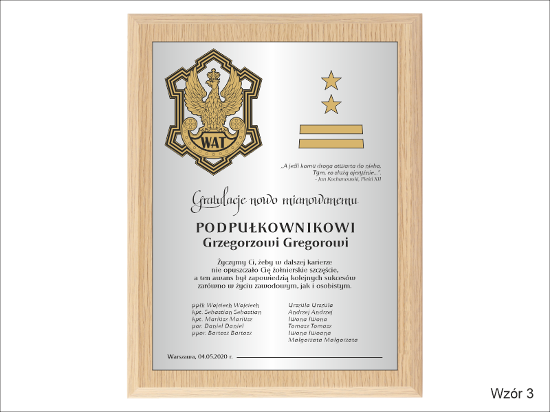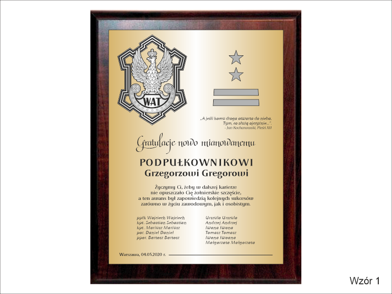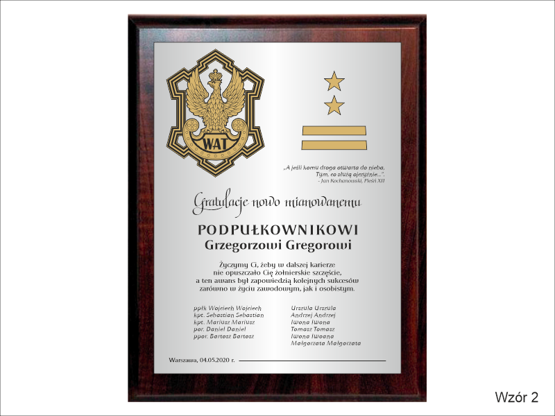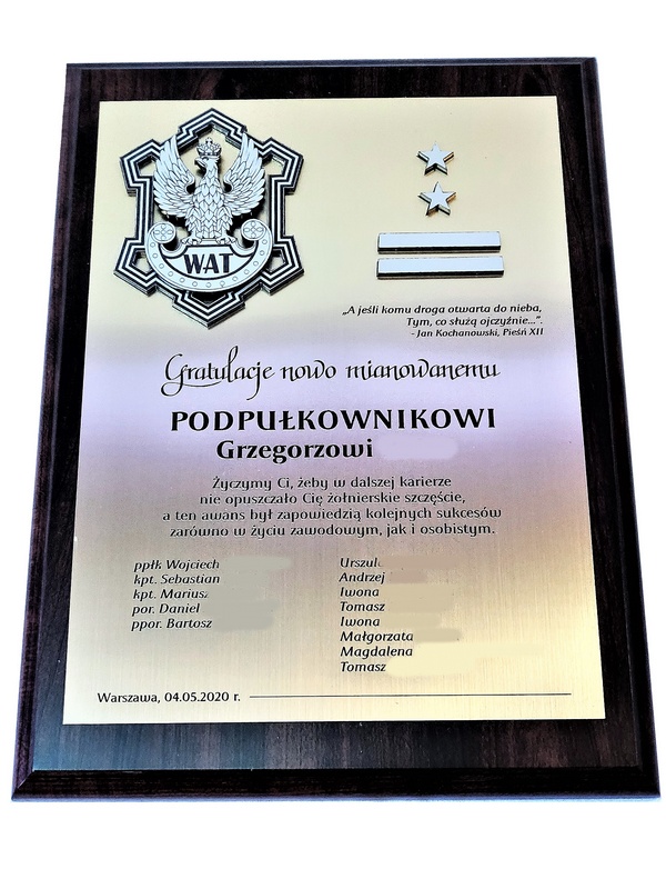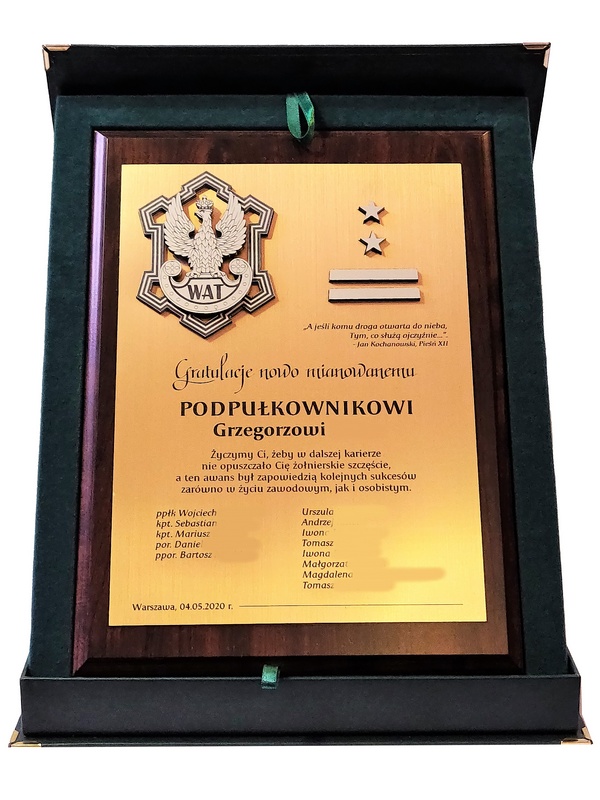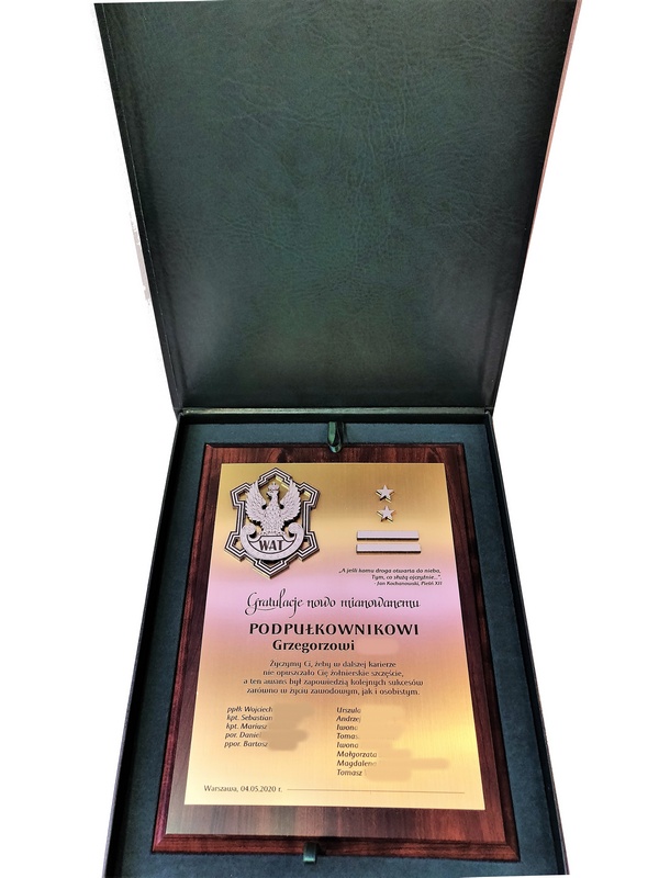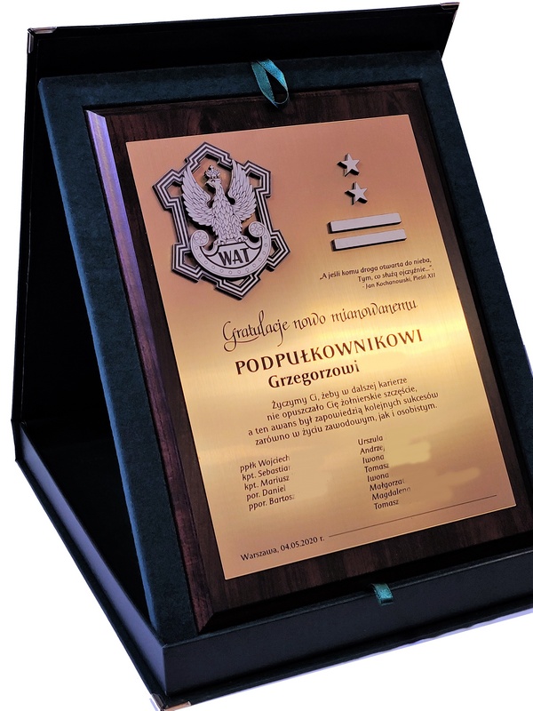 Dyplom drewniany grawerowany złożony, wykonany na standardowym podkładzie jako gratulacje z okazji awansu na wyższy stopień.