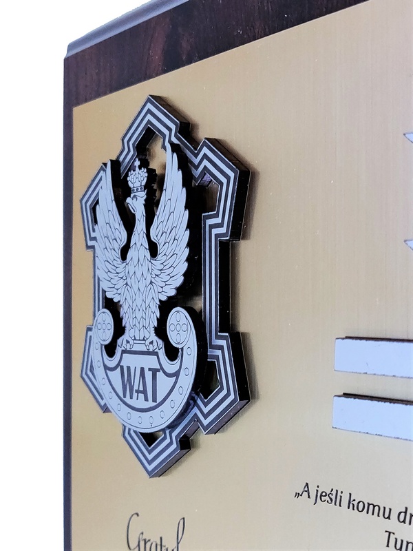 - z odznaki, herbu wyciętego i przegrawerowanego z grubego złotego lub srebrnego laminatu