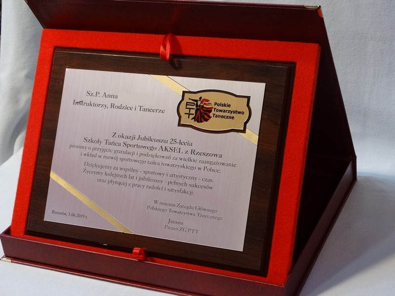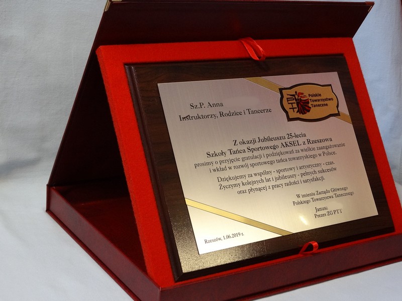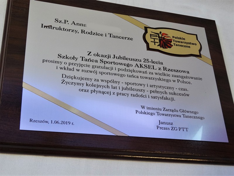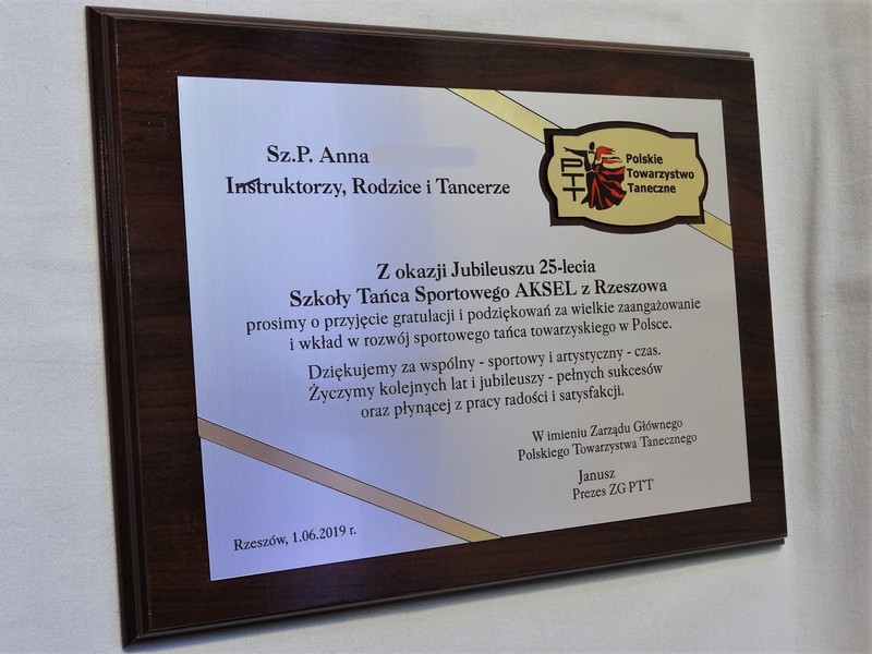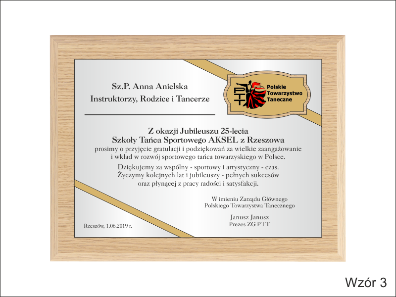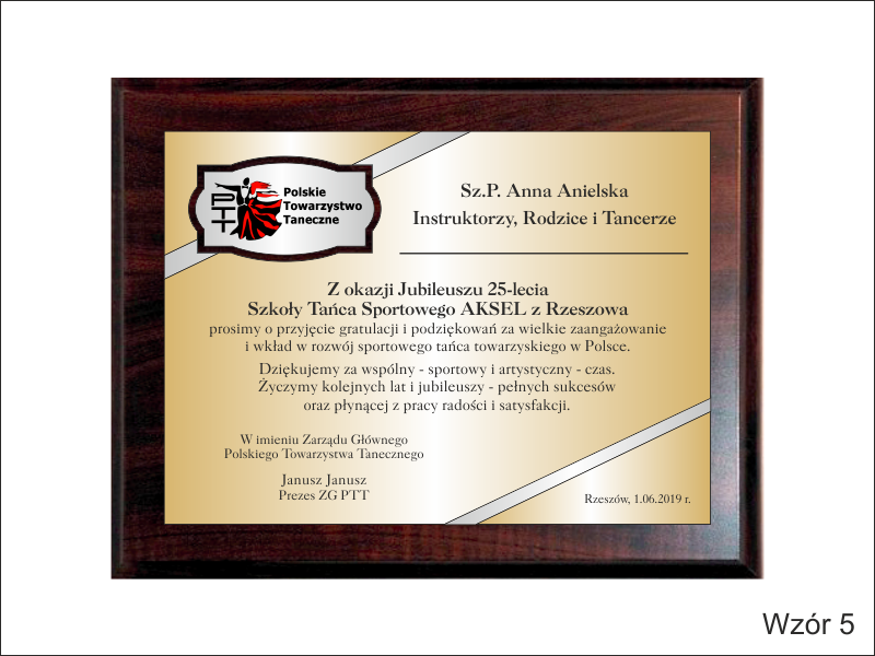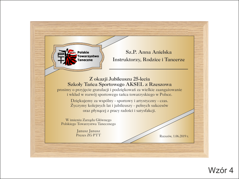 - z dopasowanych do siebie kilku laminatów (srebrnego i złotego), z wygrawerowaną i/lub nadrukowaną dedykacją, herbem, logiem