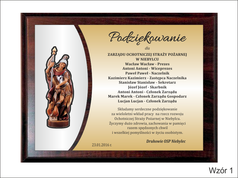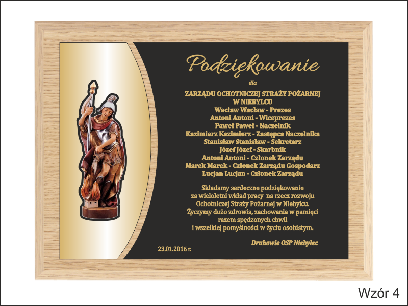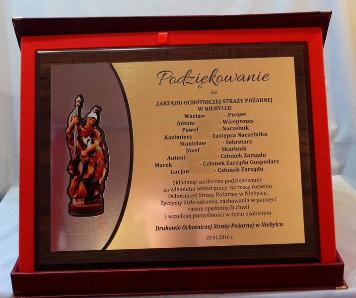 Dyplom pamiątkowy w złożonej formie na drewnianym podkładzie, jako podziękowanie druhom - strażakom, składający się: