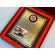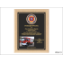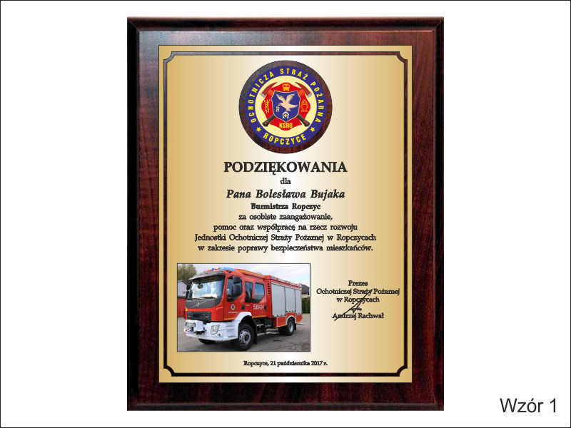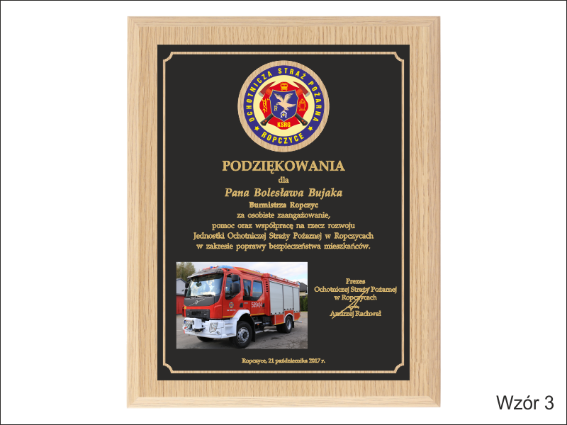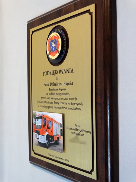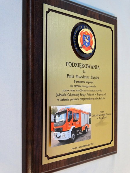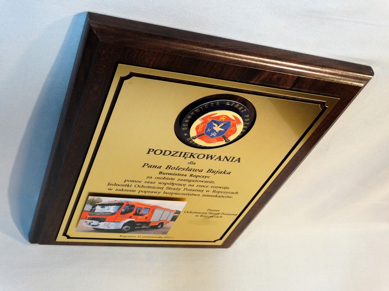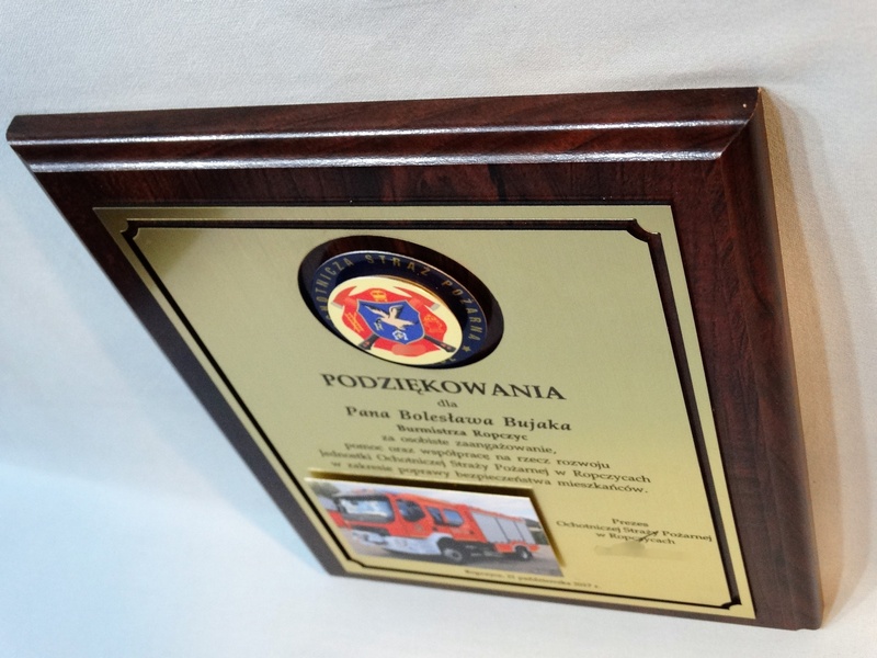 - z laminatu z wygrawerowaną dedykacją i wyciętym miejscem na odznakę,