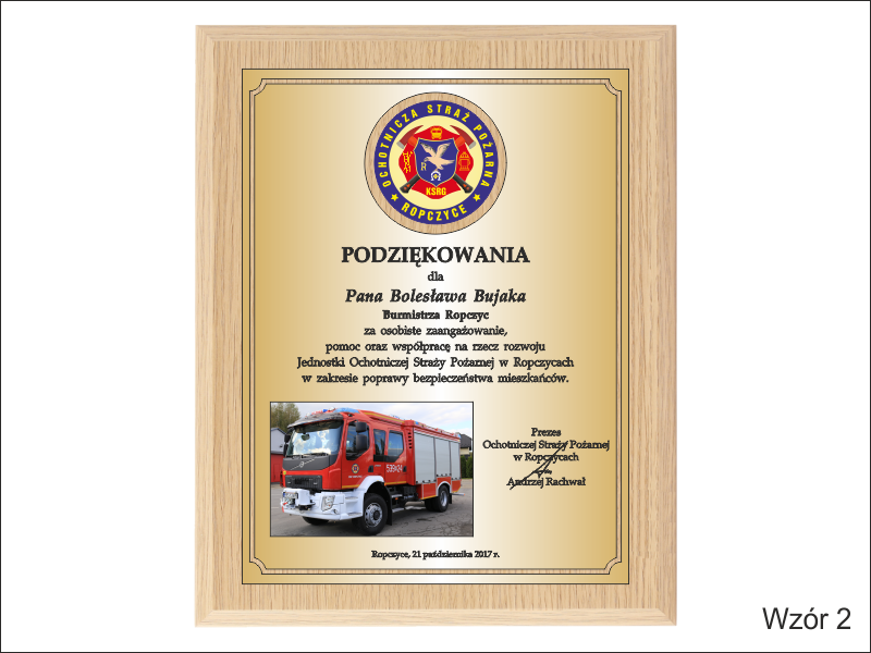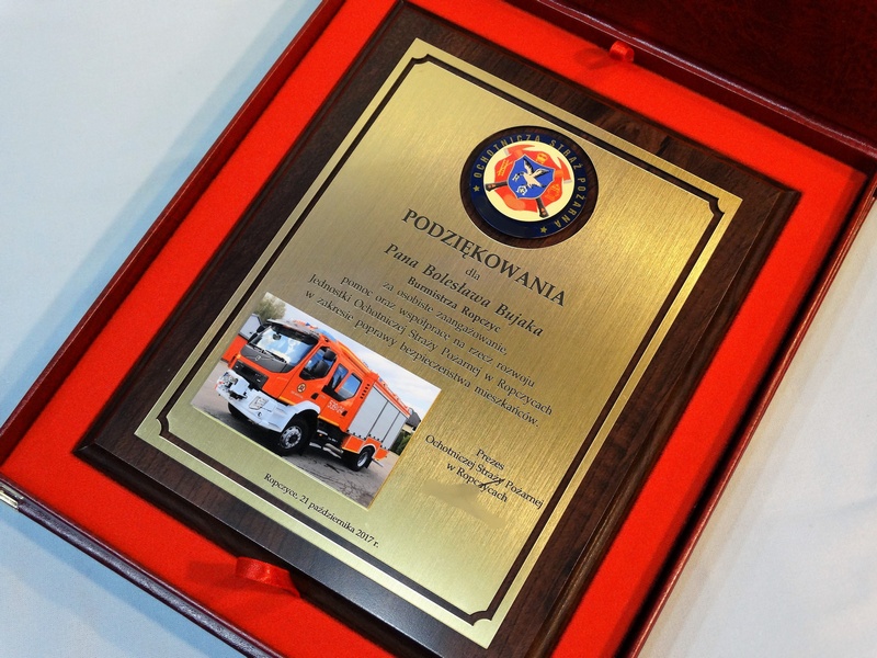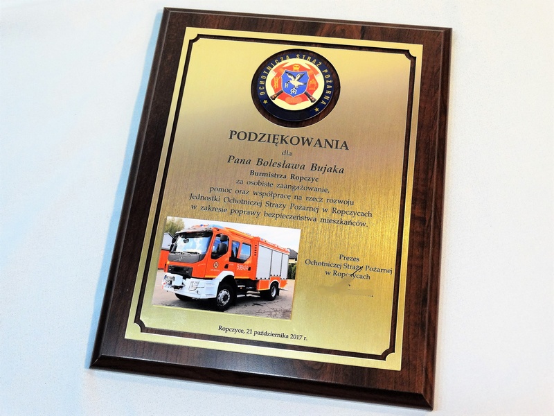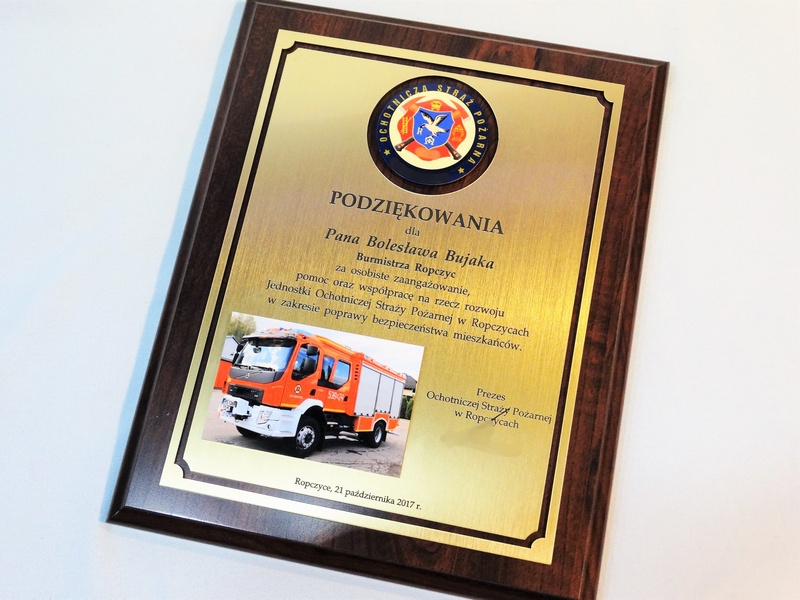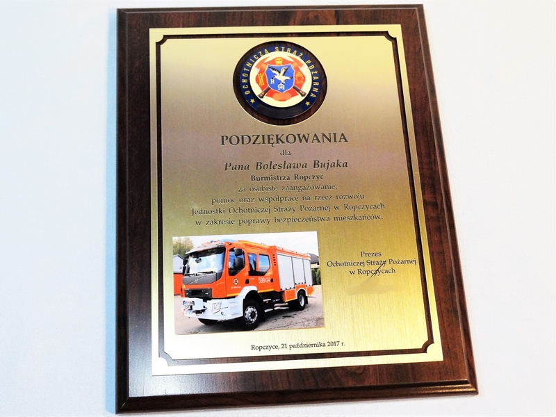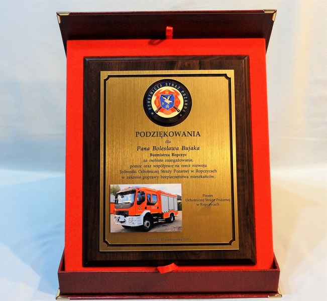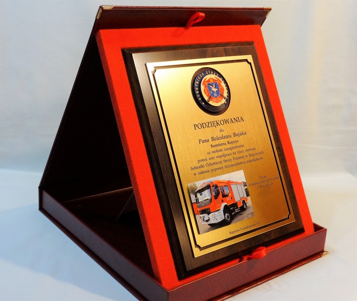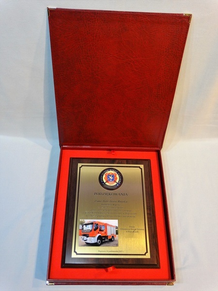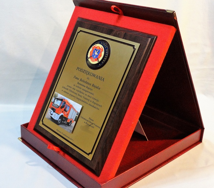 Złożony dyplom okolicznościowy na drewnianym podkładzie jako podziękowanie za wsparcie od strażaków.