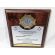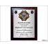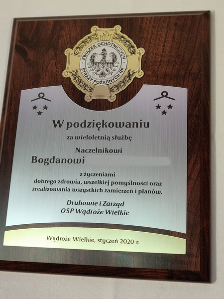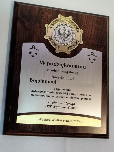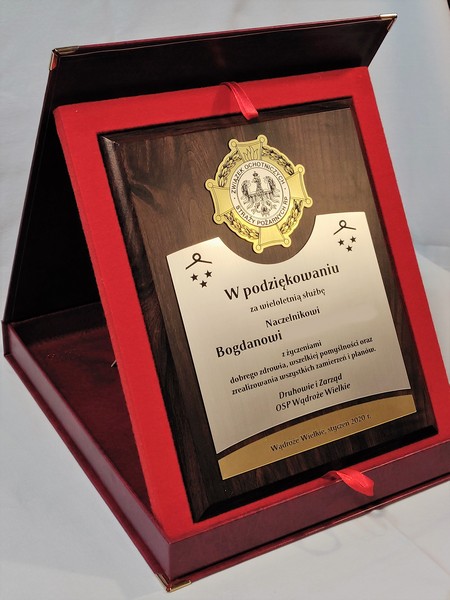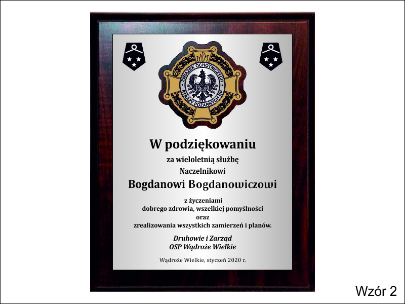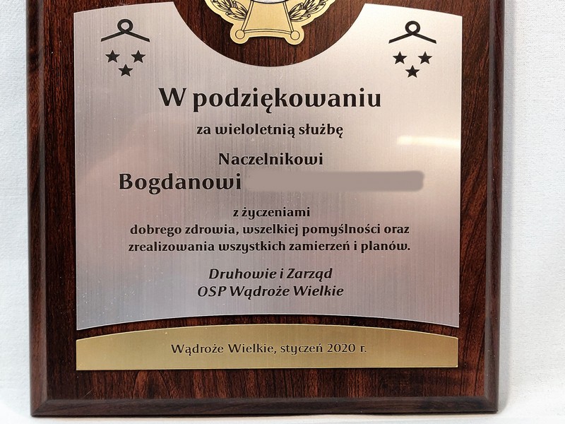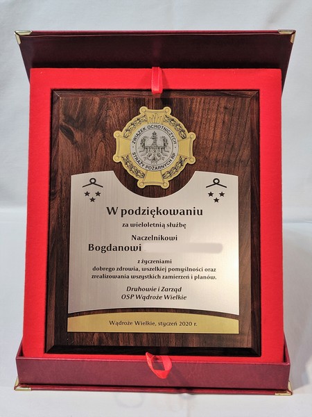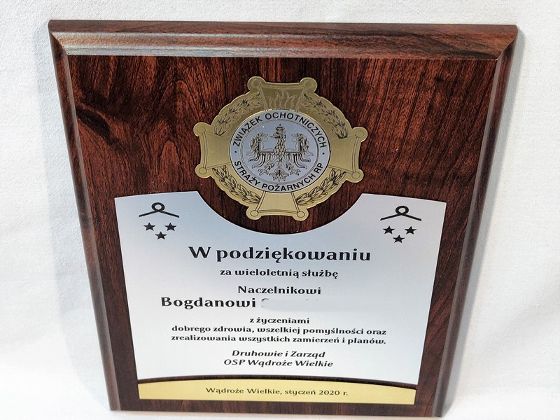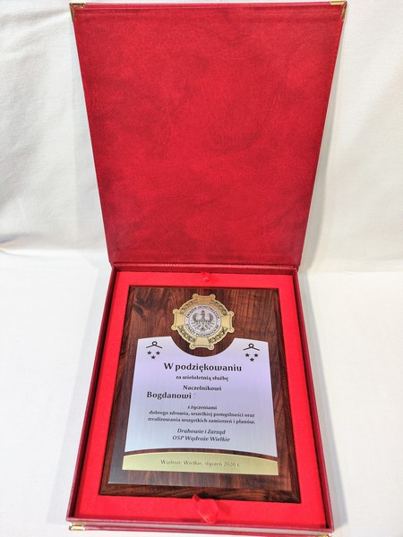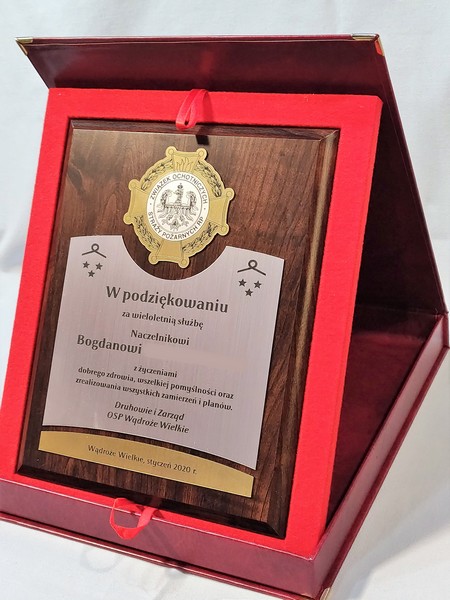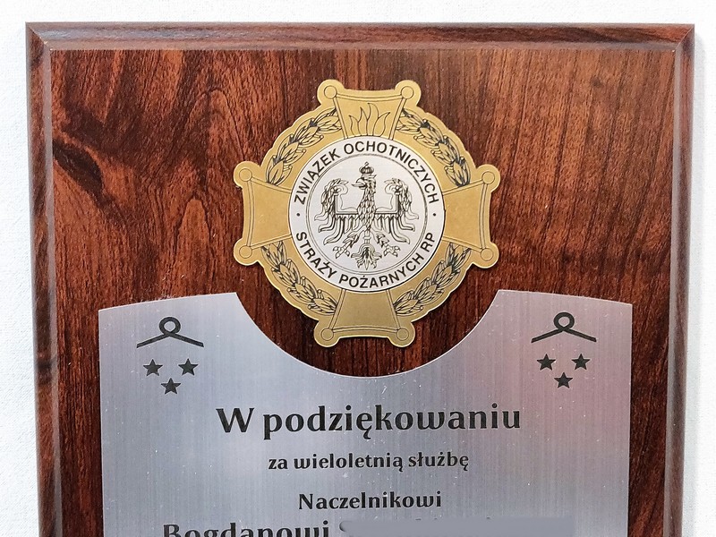 Dyplom drewniany złożony, wykonany na standardowym podkładzie z emblematem w postaci odznaki i podziękowaniem dla strażaka.