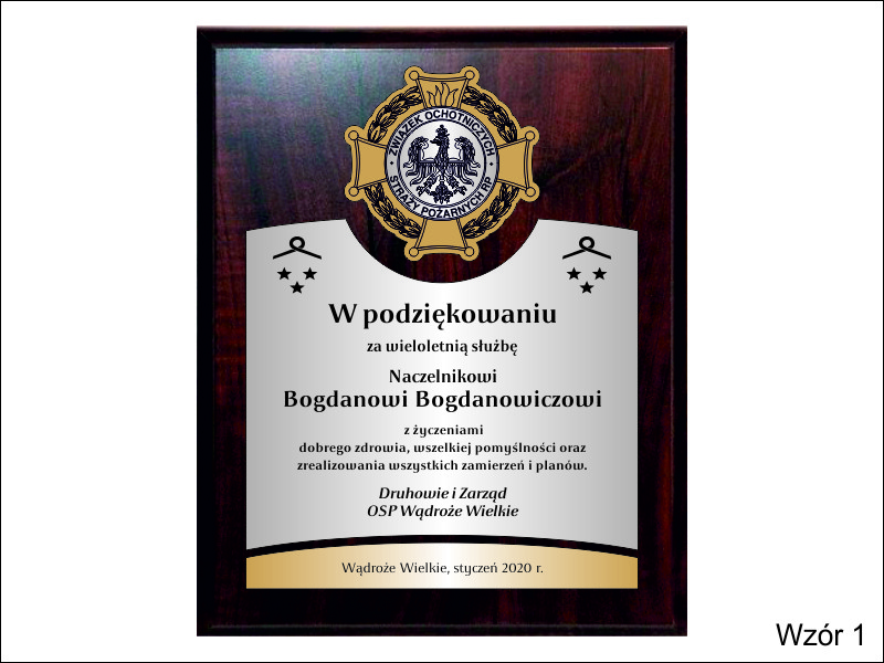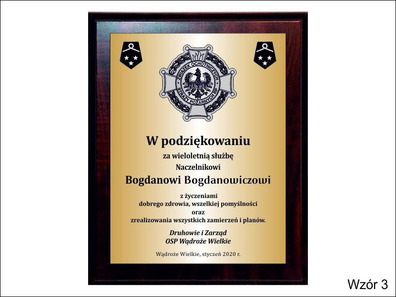 - z dodatkowej odznaki / herbu / loga wykonanej z grawerowanego laminatu umieszczonej powyżej laminatu z dedykacją,