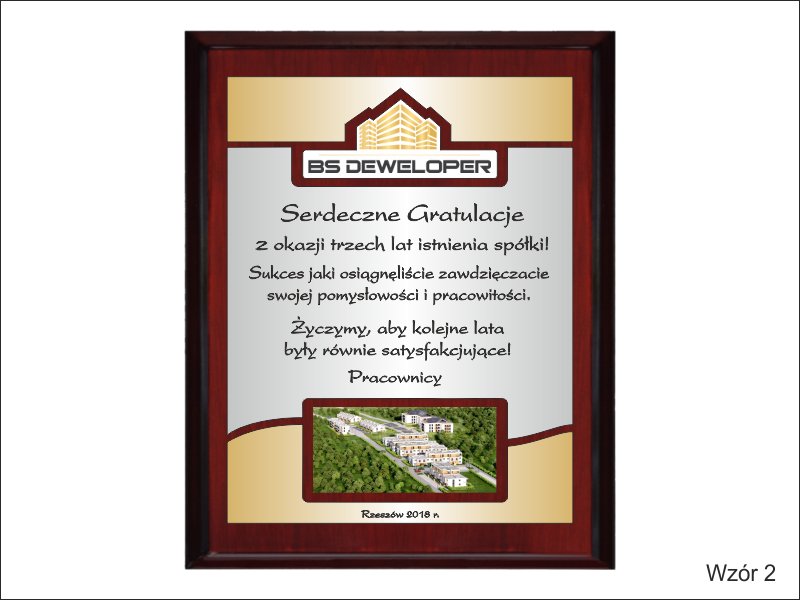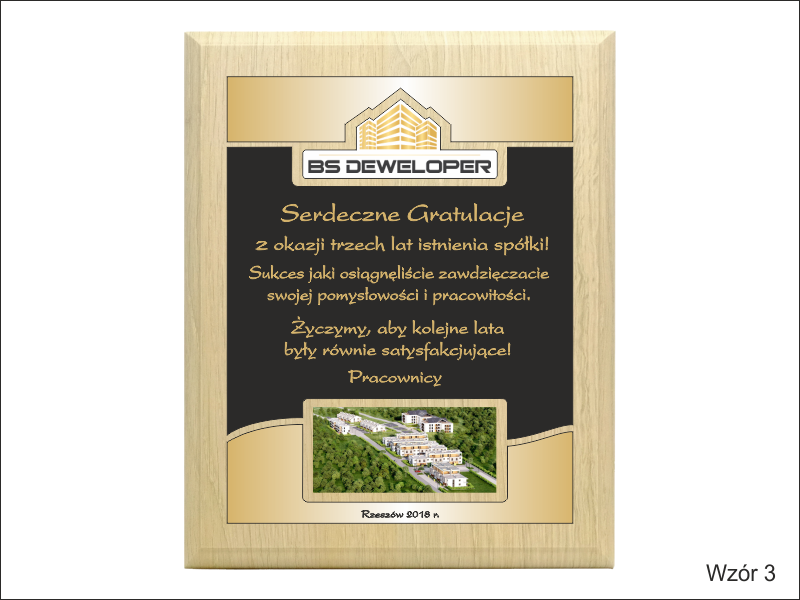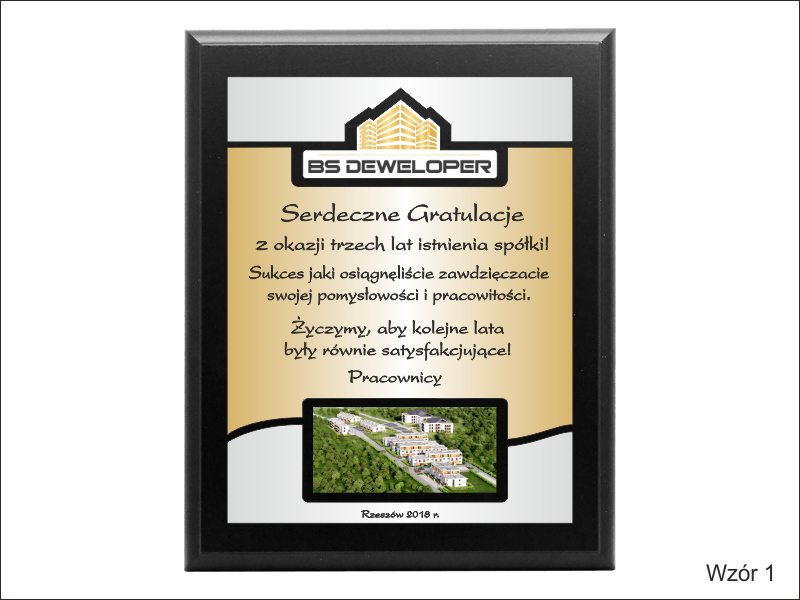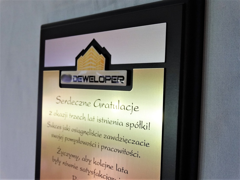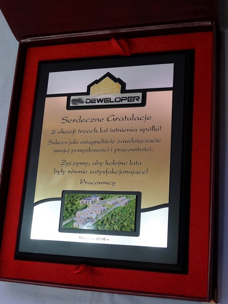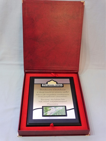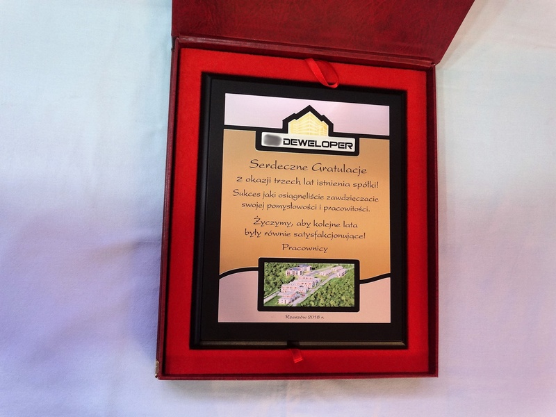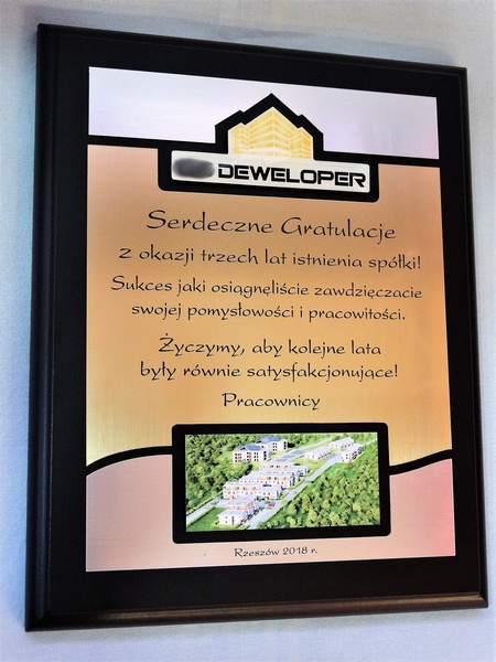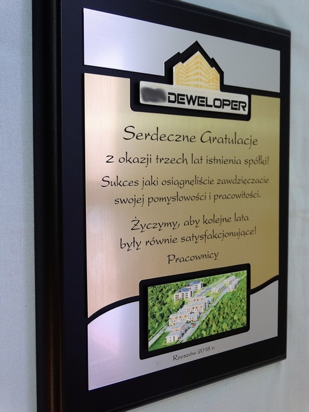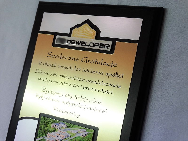 - z dopasowanych do siebie laminatów z wygrawerowaną dedykacją i wkomponowanym miejscem na logotyp i zdjęcie,