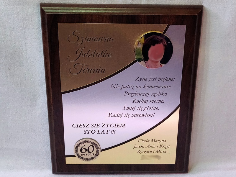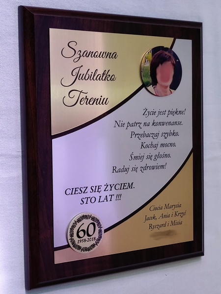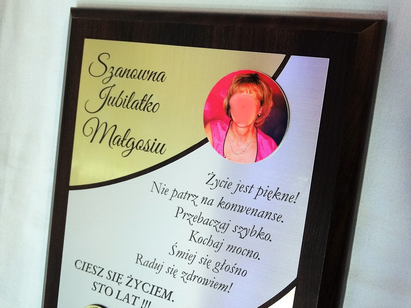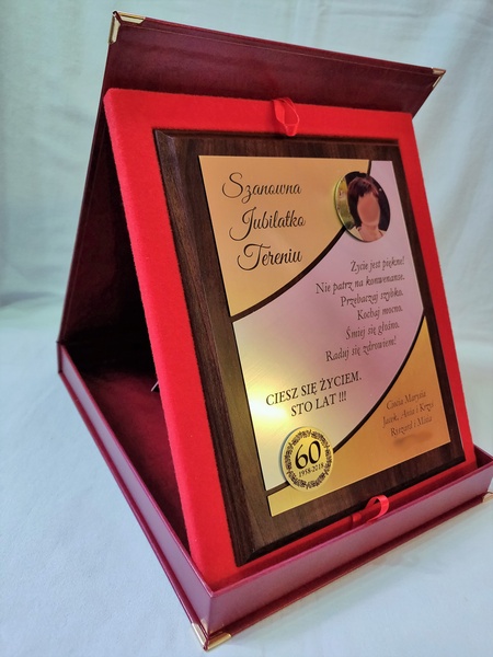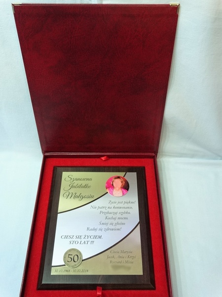 - z dopasowanych do siebie złotego i srebrnego laminatów z grawerowaną dedykacją oraz
