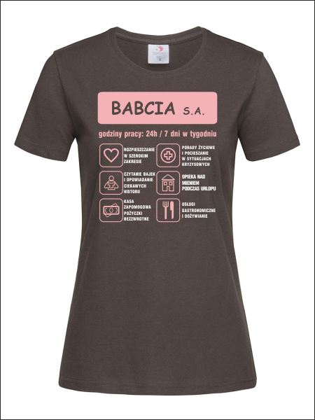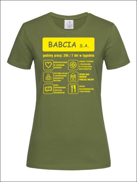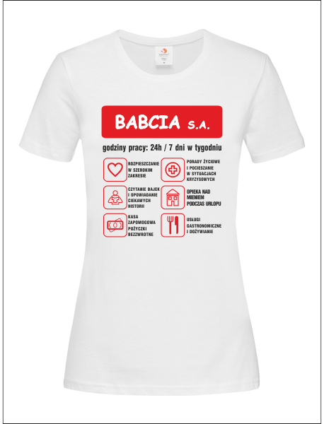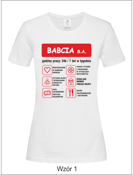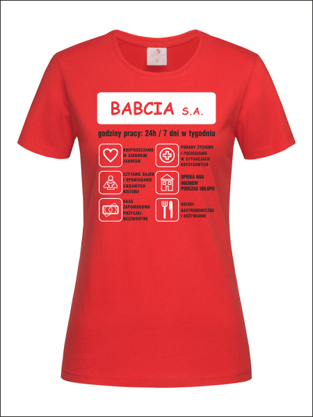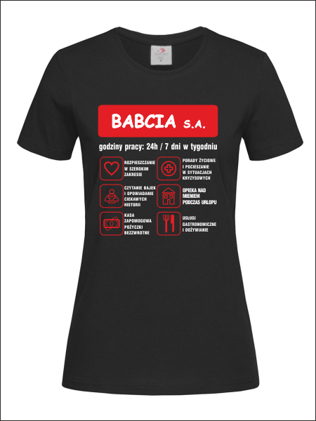 Na przodzie koszulki wykonany jest nadruk piktogramów i żartobliwej dedykacji dla Babci - "Babcia SA".