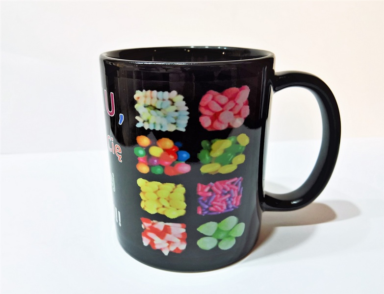 Powierzchnia kubka pokryta jest specjalną, przyjmującą nadruk powłoką, dodatkowo utwardzoną, co zapewnia odporność na mycie w zmywarce.