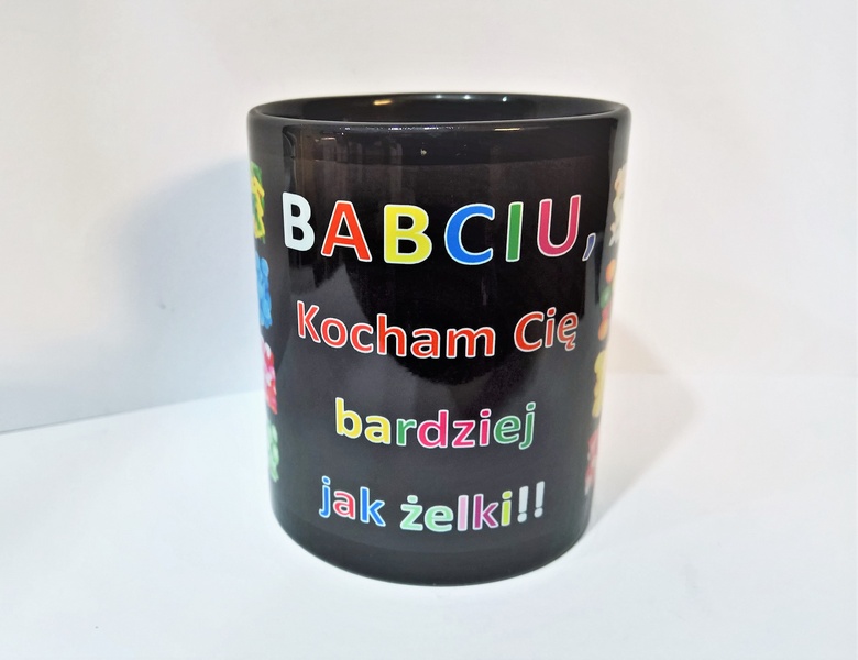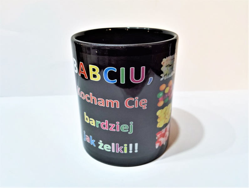 Upominek dla Babci i Dziadka w postaci czarnego kubka z okienkiem do nadruku.