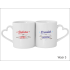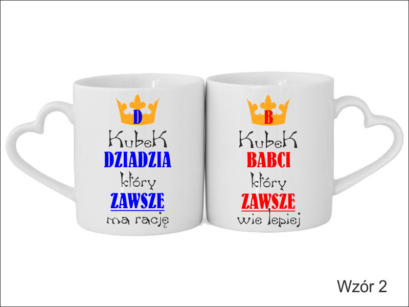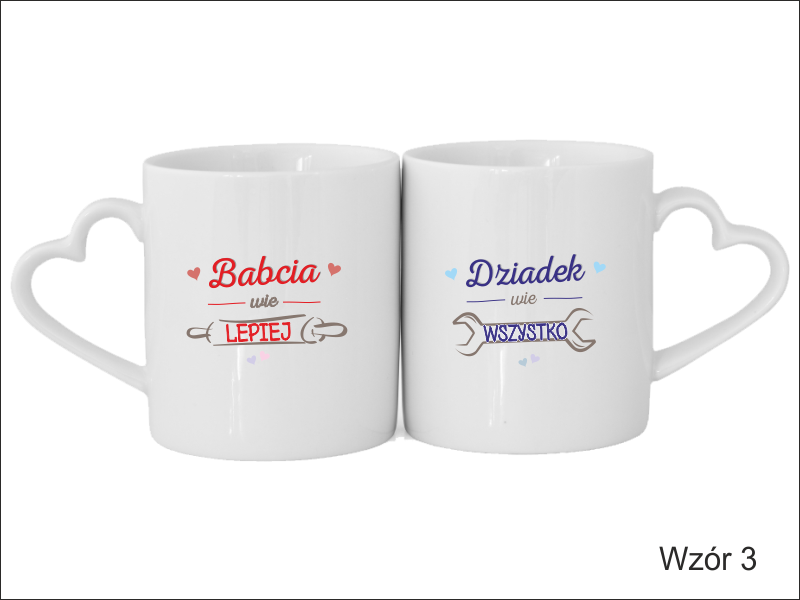 Upominek dla Babci i Dziadka w postaci kompletu kubeczków Amor Duo z uchwytem w kształcie serca, z nadrukiem.
