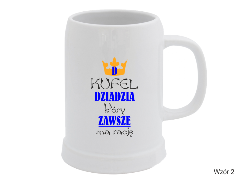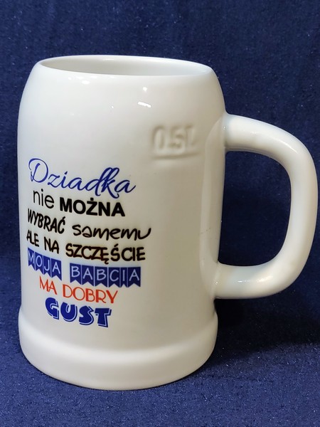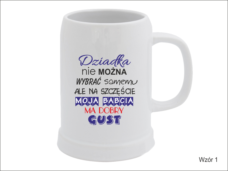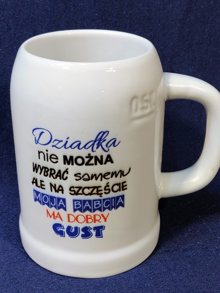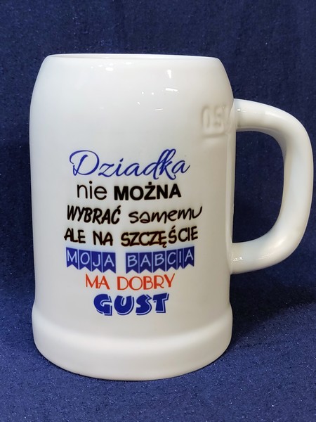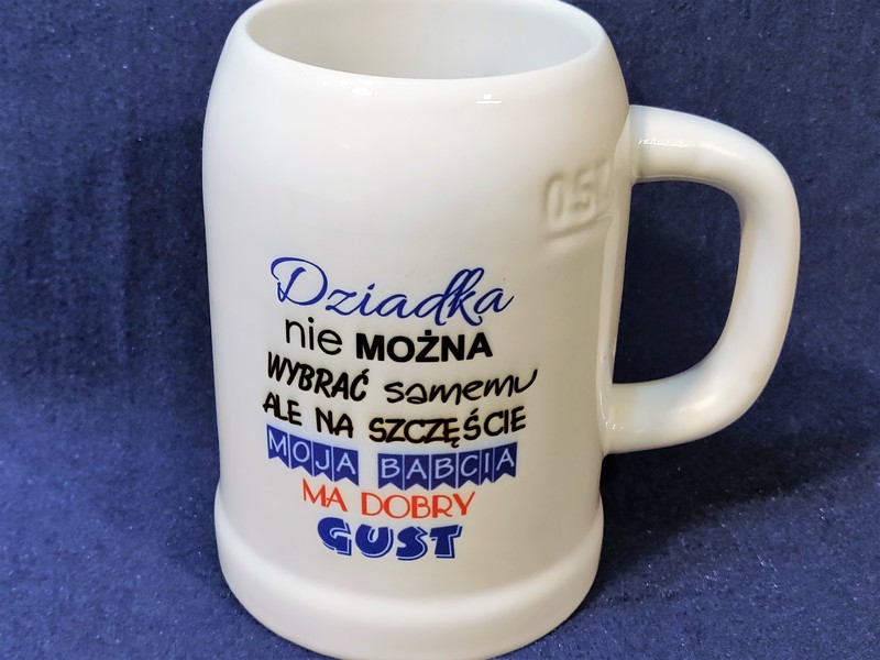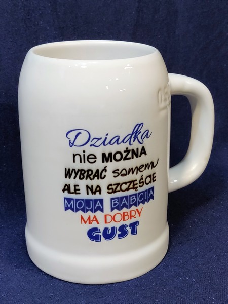 Upominek dla Dziadka w postaci ceramicznego kufla do piwa z nadrukiem.