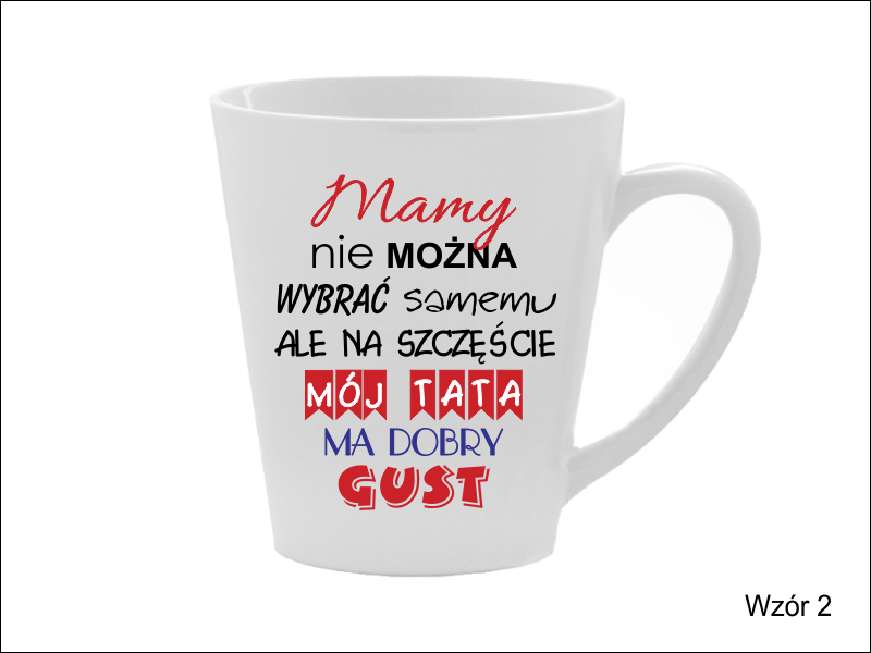 Nadruk dedykacji na kubku jest dowolny. Można wykorzystać jeden z wzorów lub wykonać wg indywidualnego projektu.