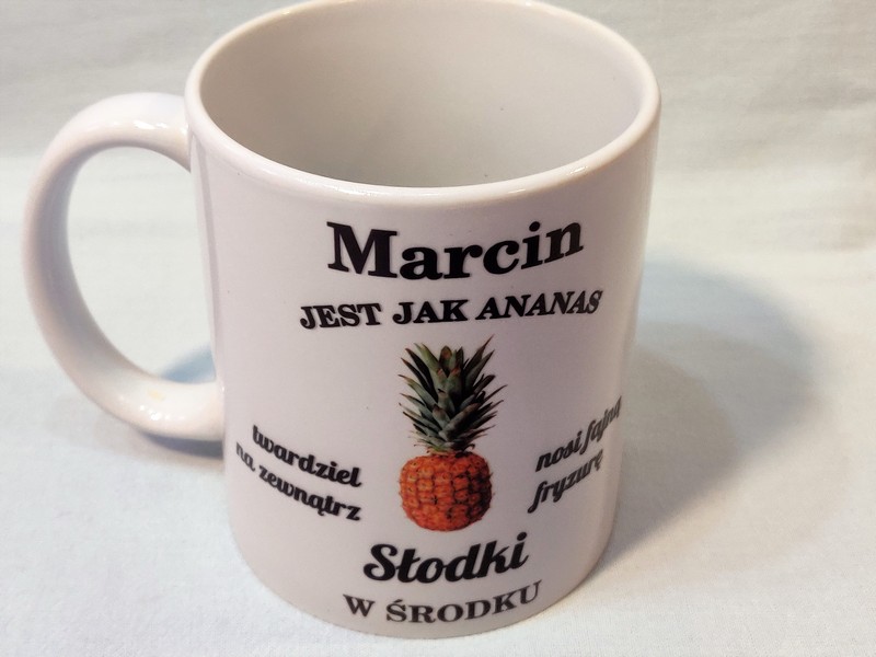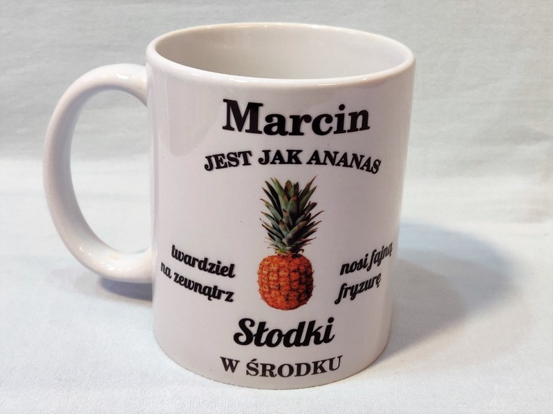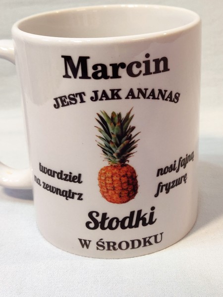 Na kubku wykonany jest pełnokolorowy nadruk pamiątkowej dedykacji "Jak Ananas".