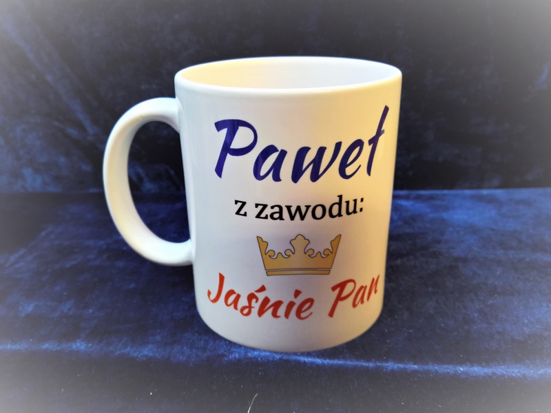 Na kubku wykonny jest pełnokolorowy nadruk pamiątkowej dedykacji "Jaśnie Pani" - dla Niej lub "Jaśnie Pan" - dla Niego.