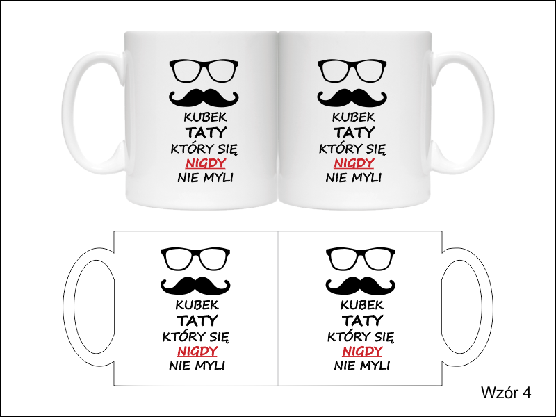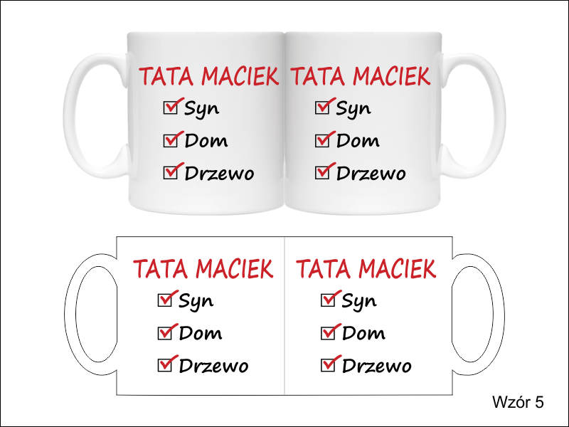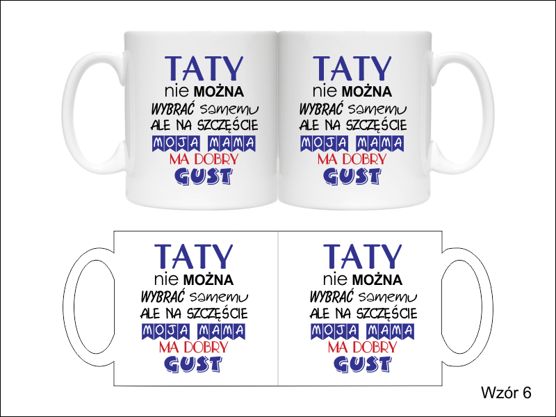 Nadruk dedykacji na kubku jest dowolny i można wykorzystać jeden z wzorów lub wykonać wg indywidualnych ustaleń.