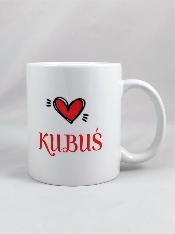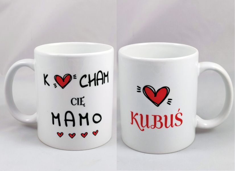 Nadruk na kubku z dedykacją "Kocham Cię Mamo" oraz imieniem dziecka wykonany jest po obu stronach kubeczka.