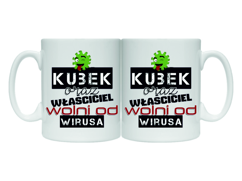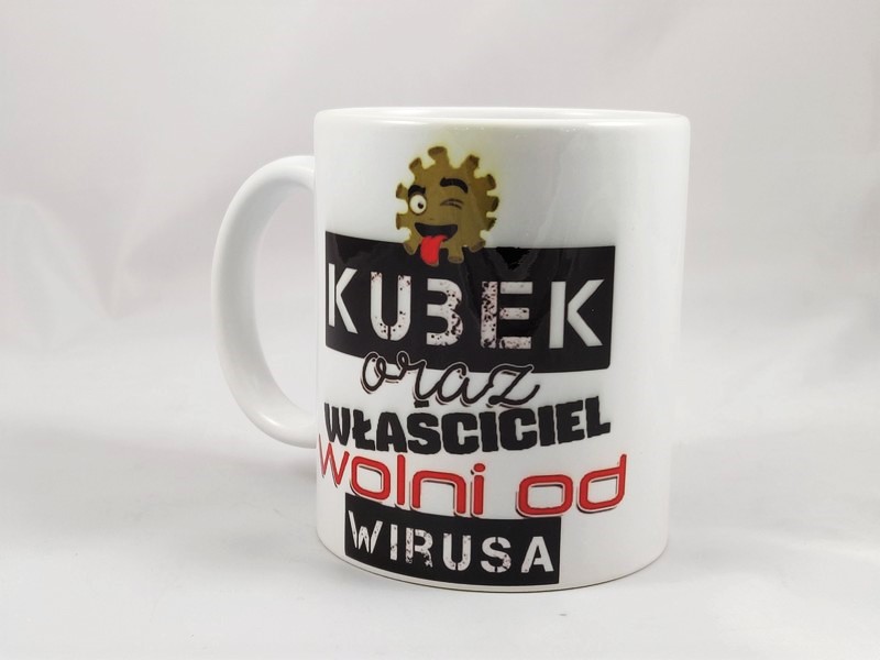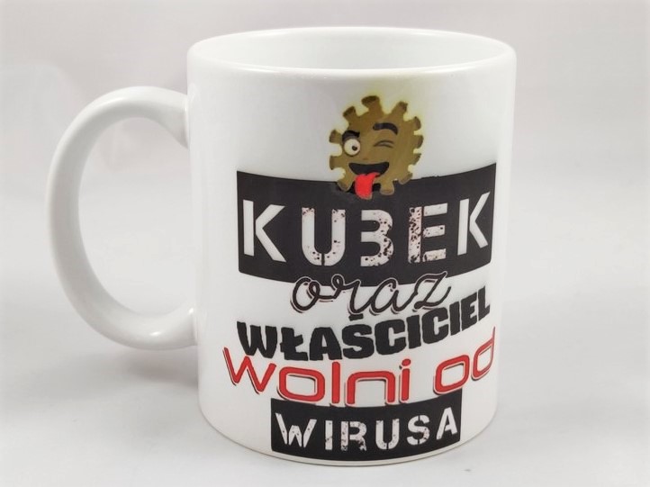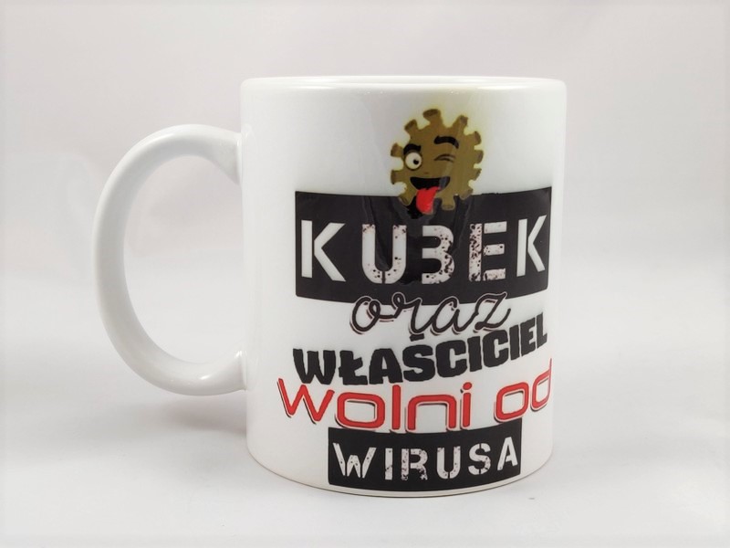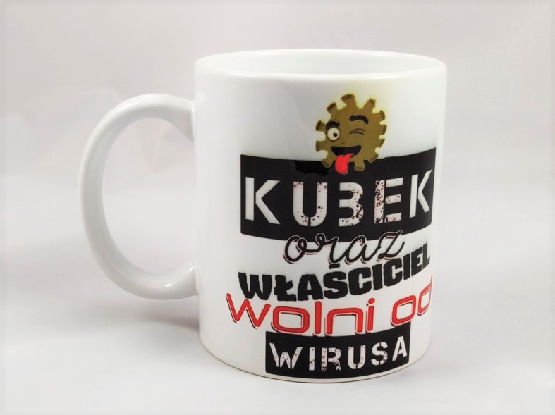 Na kubku wykonany jest nadruk dedykacji "Kubek oraz właściciel wolni od wirusa".