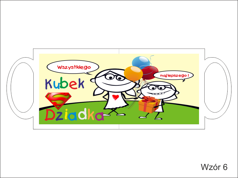 Nadruk dedykacji na kubku jest dowolny i można wykorzystać jeden z wzorów lub wykonać wg indywidualnych ustaleń.