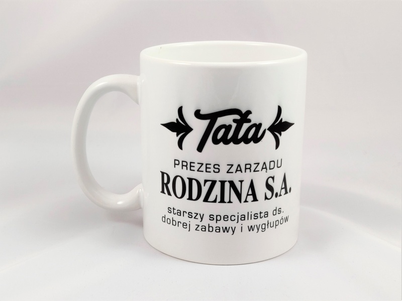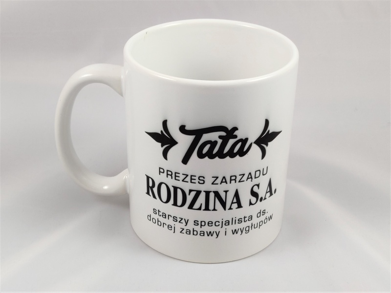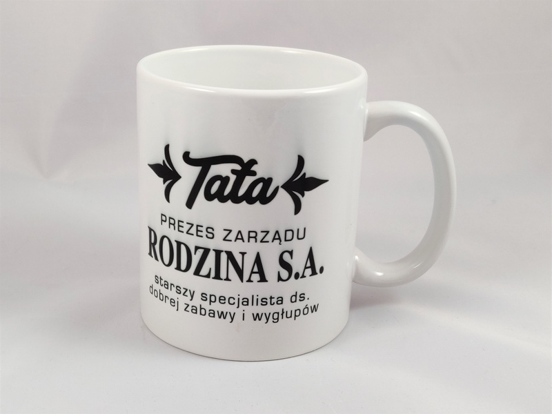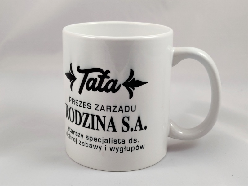 Nadruk na kubku: "Tata Prezes Zarządu Rodzina S.A." jest obustronny i wykonany jest po obu stronach kubeczka.