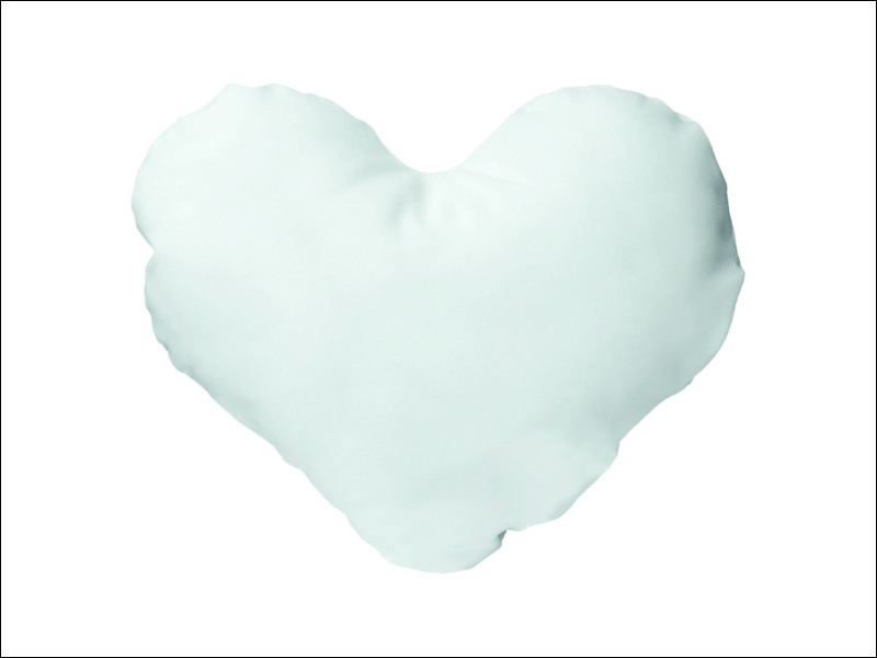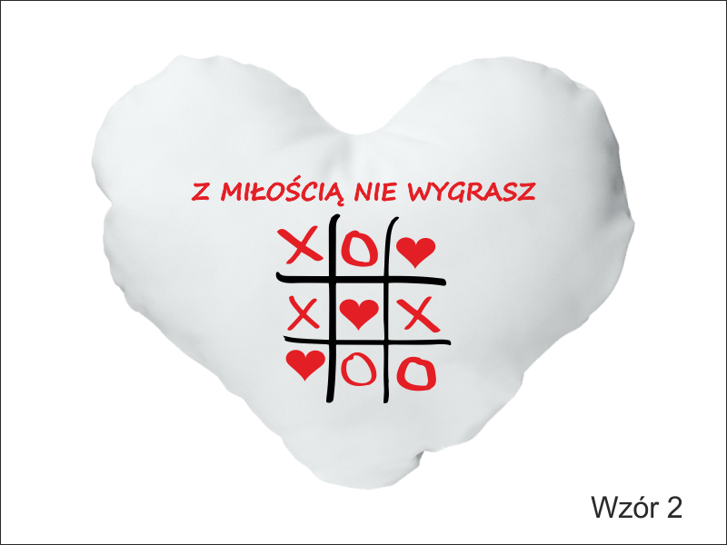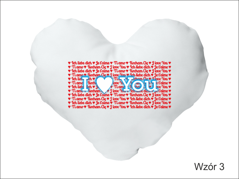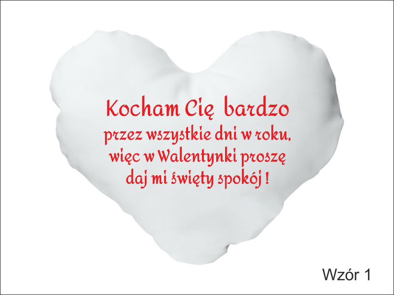 Upominek dla Zakochanych w formie białej poszewki w kształcie serca z nadrukiem dedykacji.