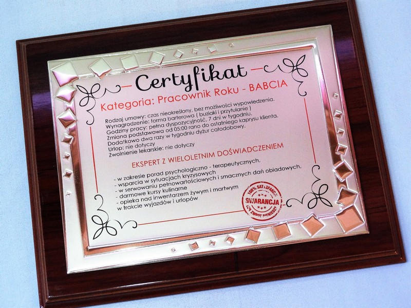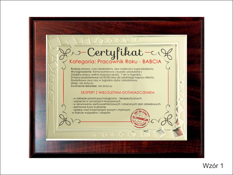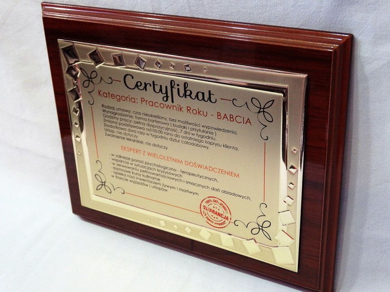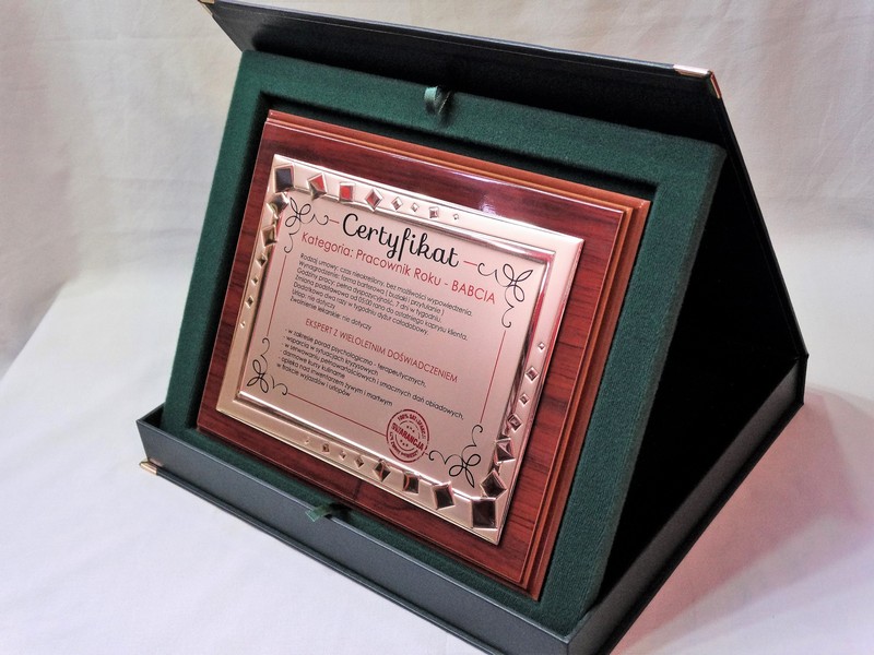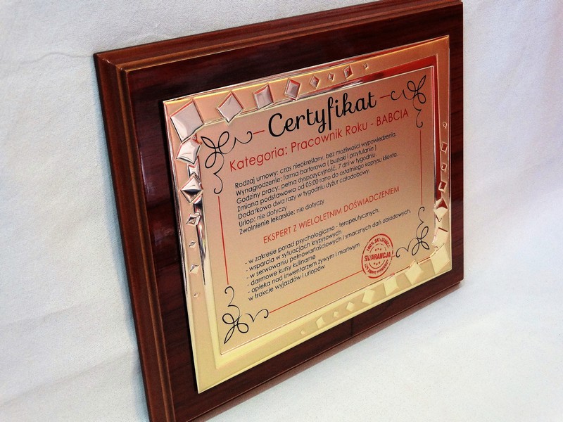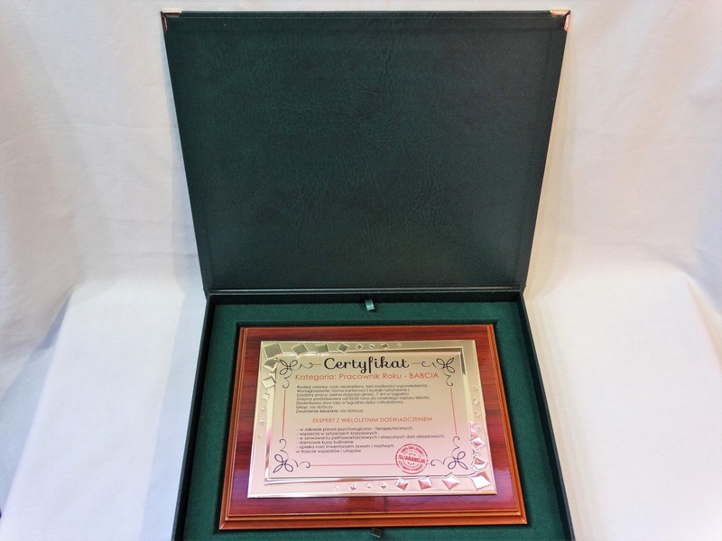 Certyfikat Babci i Certyfikat Dziadka w postaci dyplomu okolicznościowego na drewnianym podkładzie z paterą z nadrukiem.