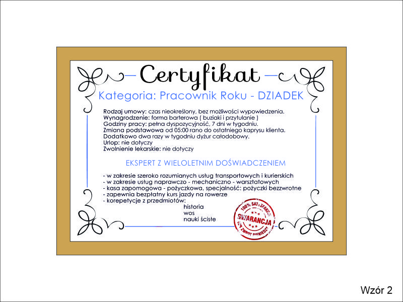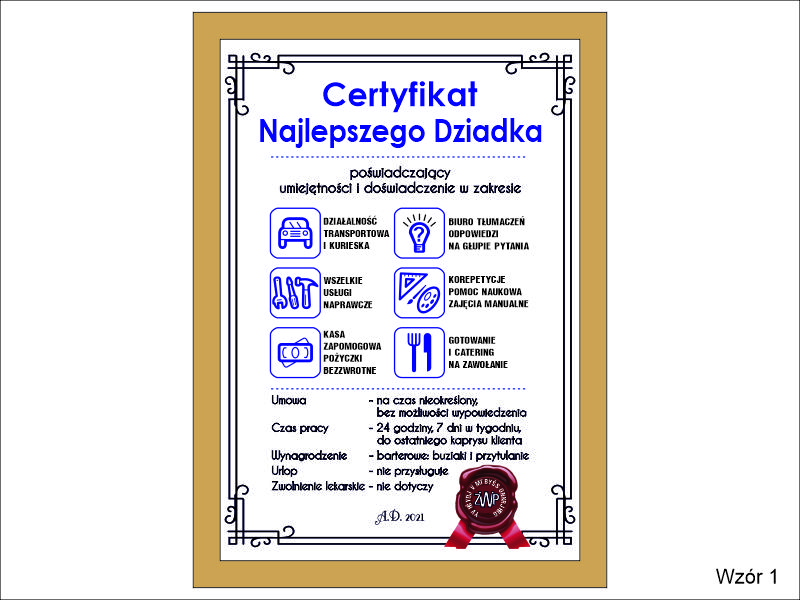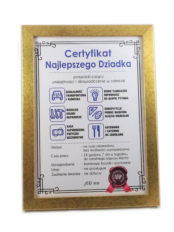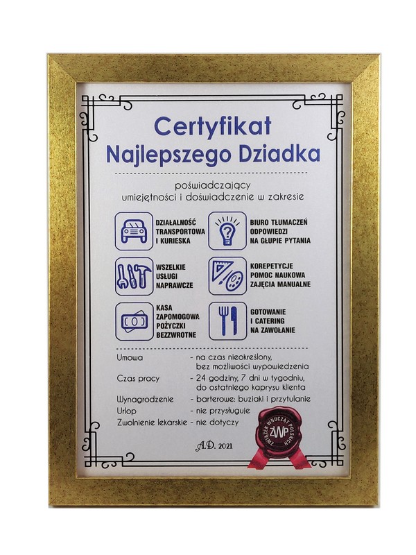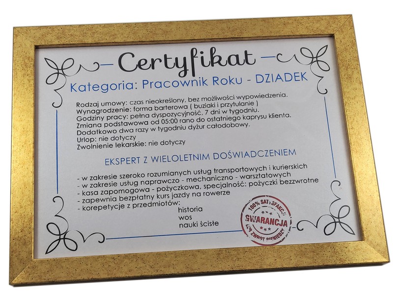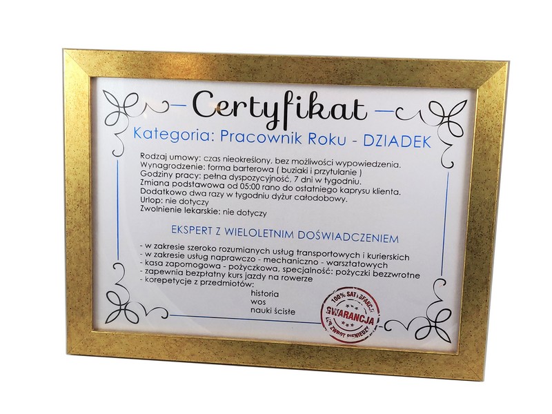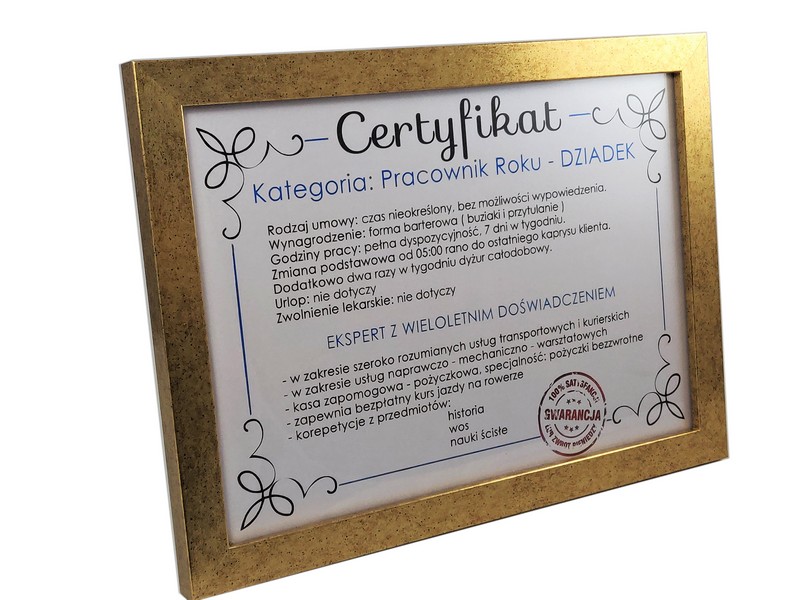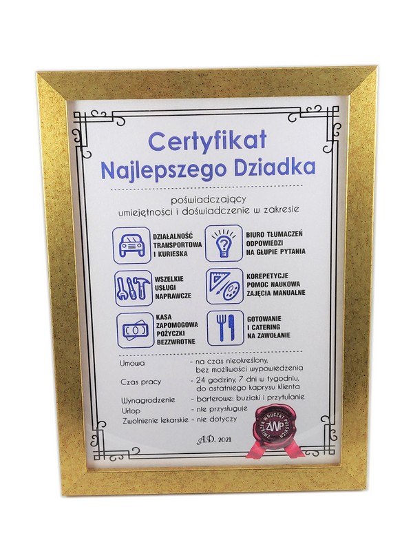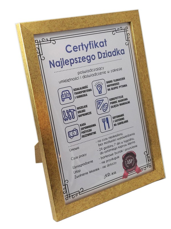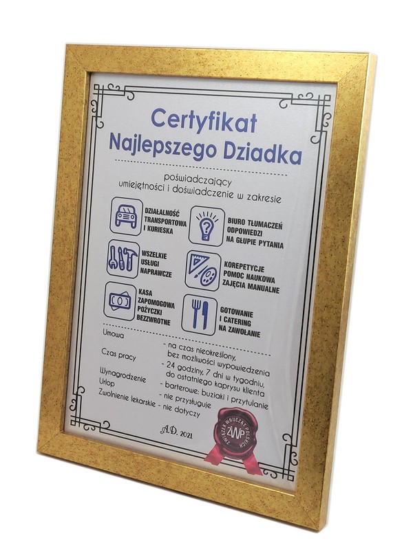 Certyfikat Najlepszego Dziadka w złotej drewniano-szklanej ramie.