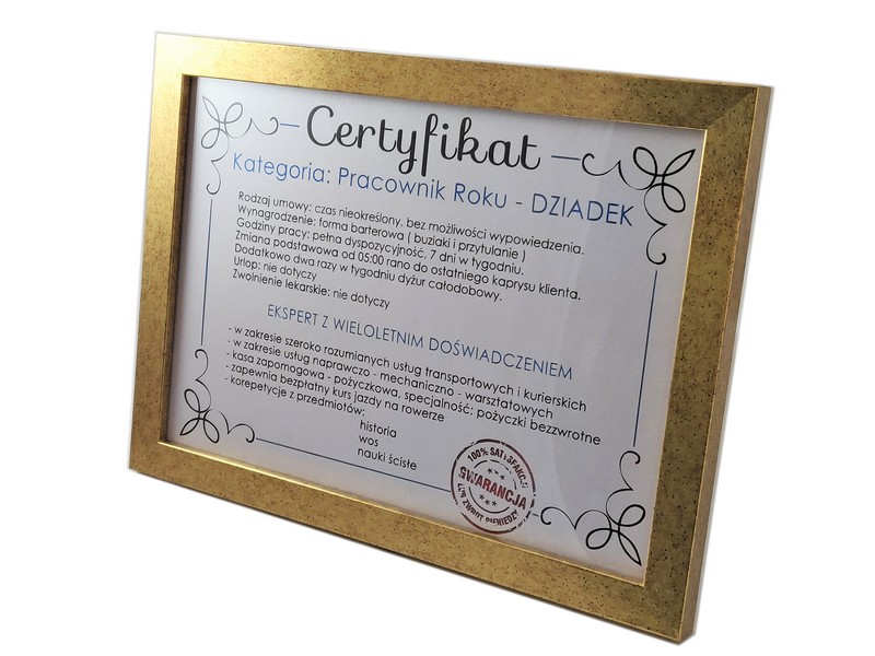 Rama ma wielkość 23 x 32 cm, a sam certyfikat nadrukowany jest na formacie A4.