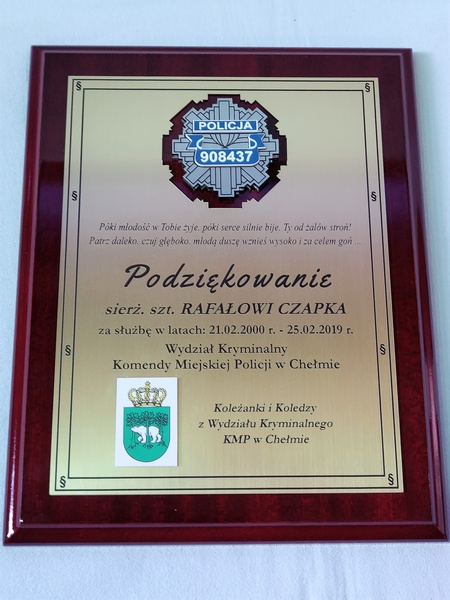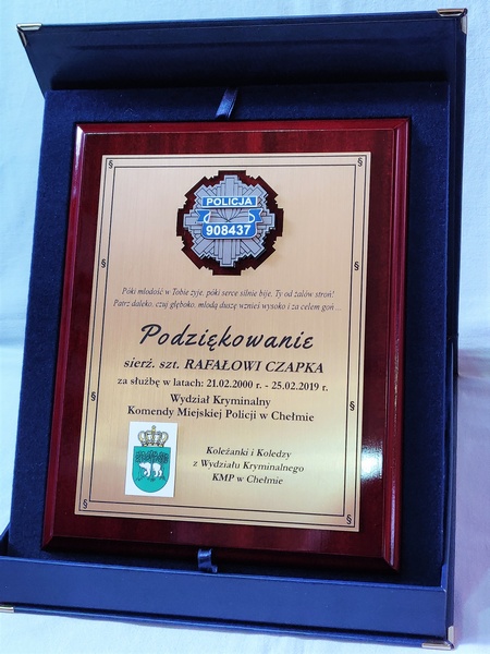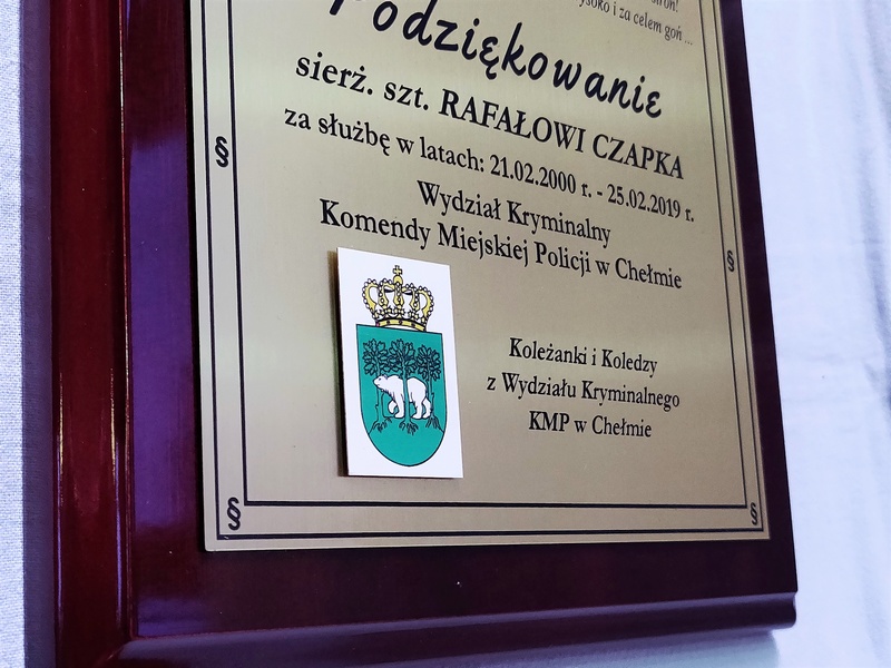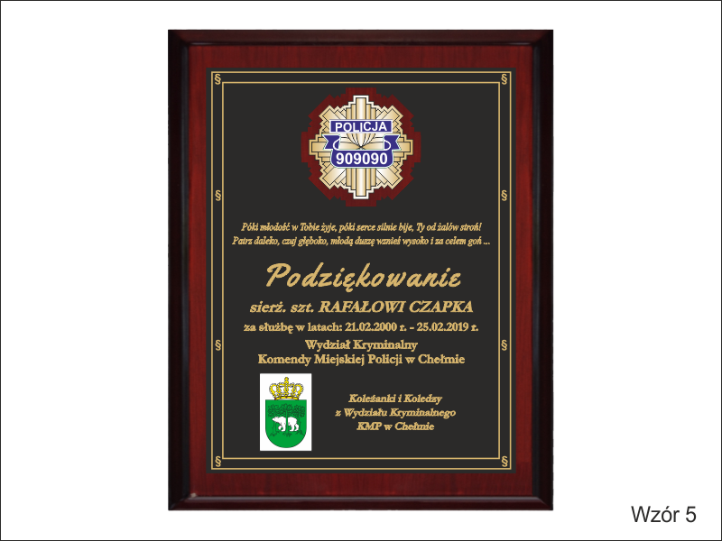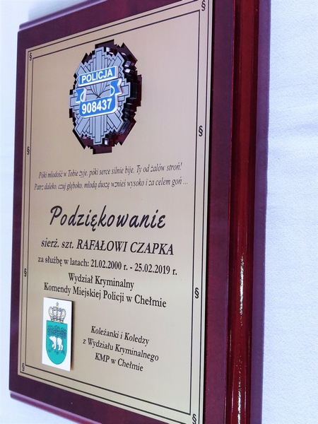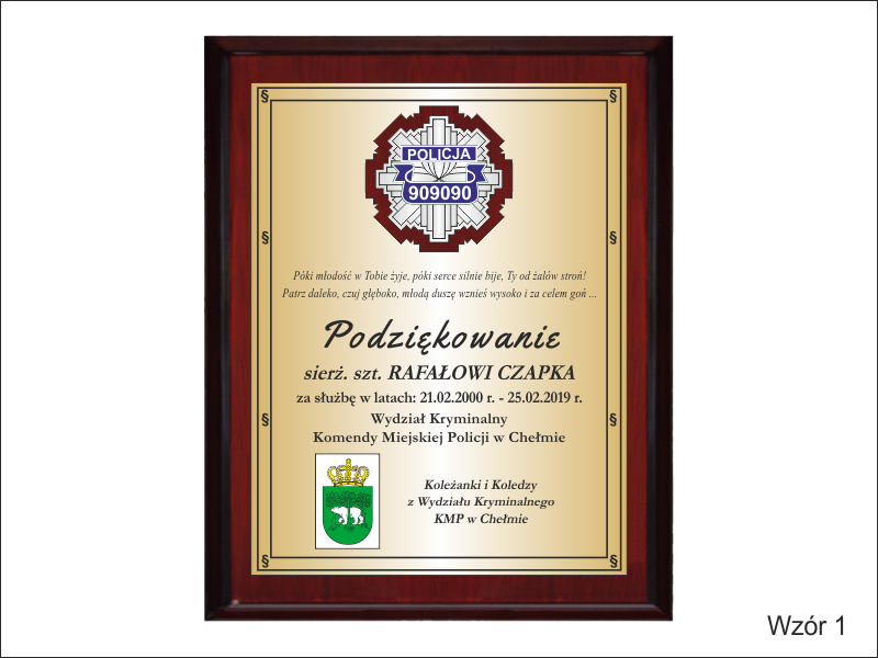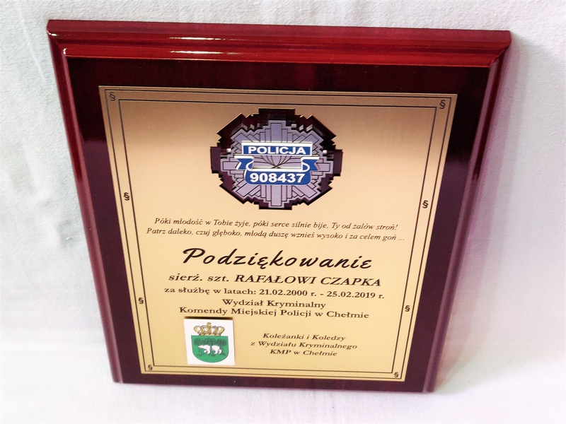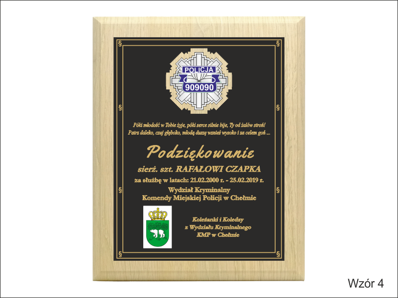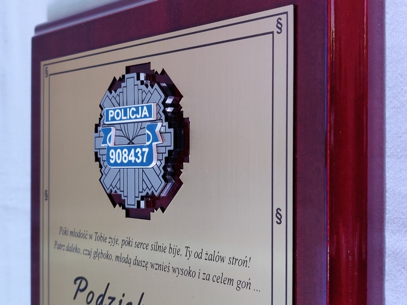- z laminatu z wygrawerowaną dedykacją i wyciętym miejscem na odznakę,