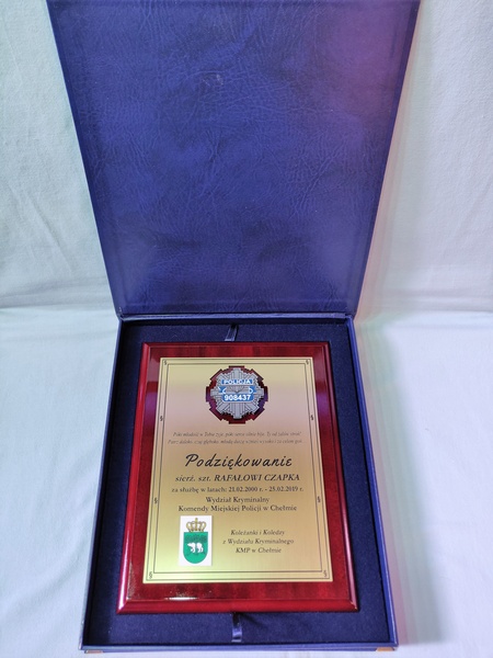 Pamiątka na zakończenie służby w policji w postaci dyplomu drewnianego złożony wykonanego na lakierowanym podkładzie, składający się: