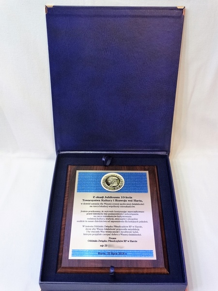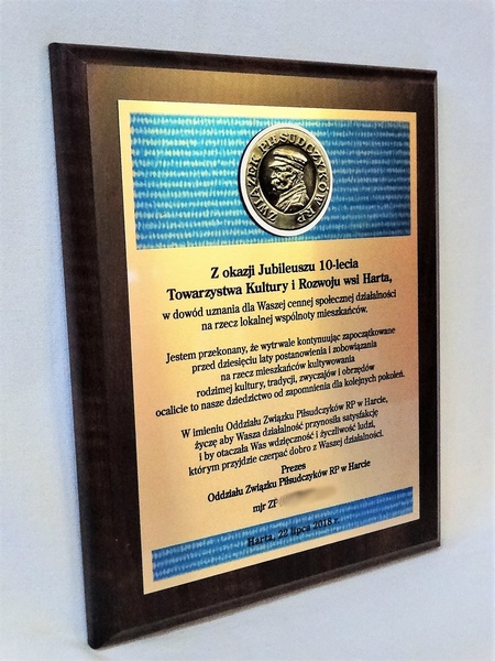 Wyrazy uznania z okazji jubileuszu działalności stowarzyszenia w postaci drewnianego dyplomu z blachą z nadrukiem.