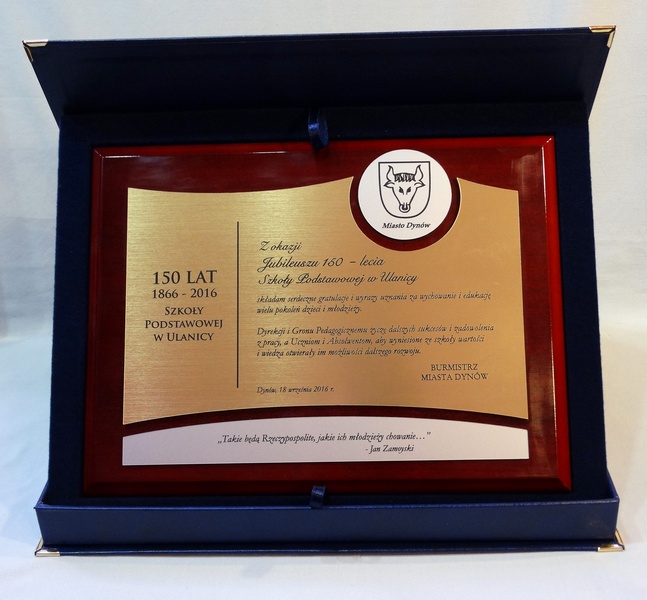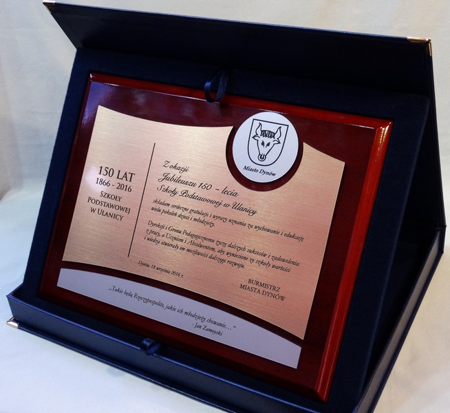 Pamiątkowy dyplom okolicznościowy na lakierowanym drewnianym podkładzie z okazji jubileuszu powstania szkoły, składający się: