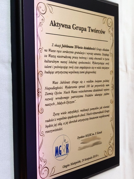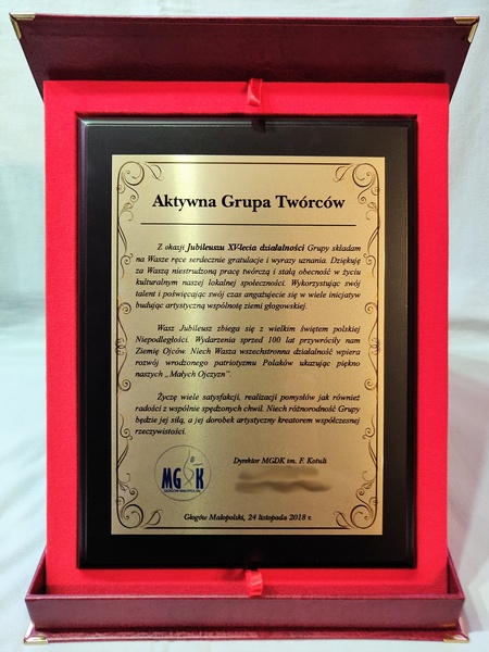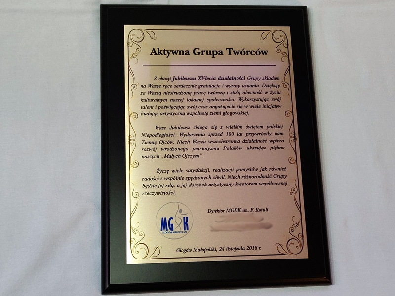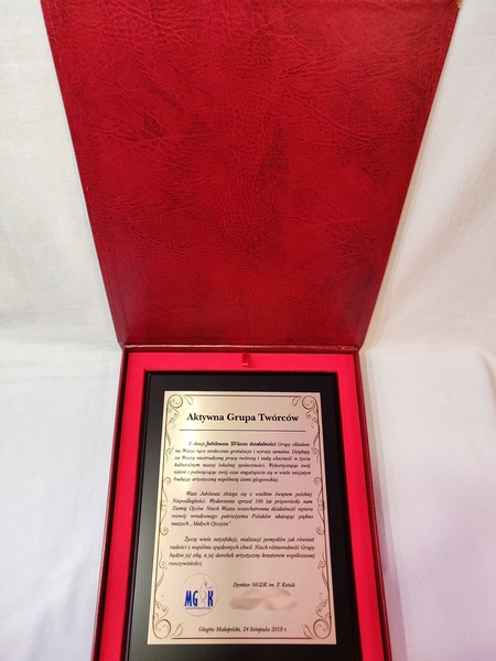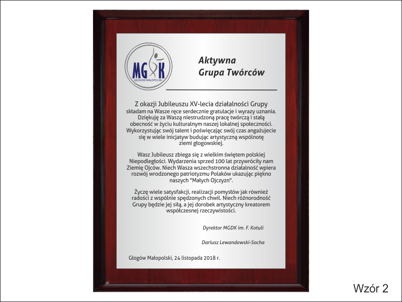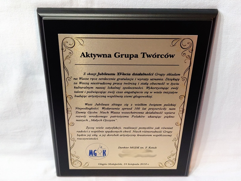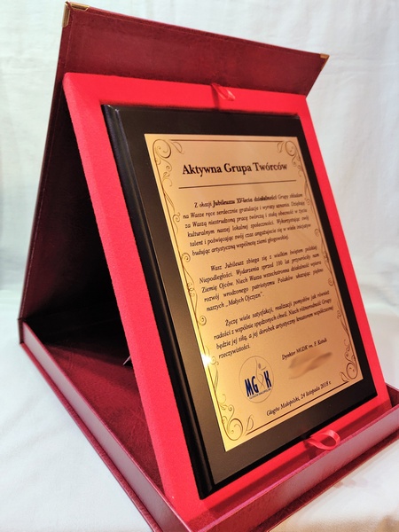 Pamiątka z okazji jubileuszu działalności stowarzyszenia w formie dyplom drewniany na lakierowanym podkładzie z nadrukowaną blachą.