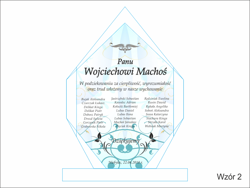 Istnieje możliwość nadruku dedykacji wg indywidualnych ustaleń i projektu lub wg jednego z wzorów.