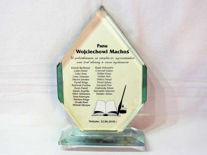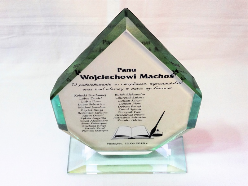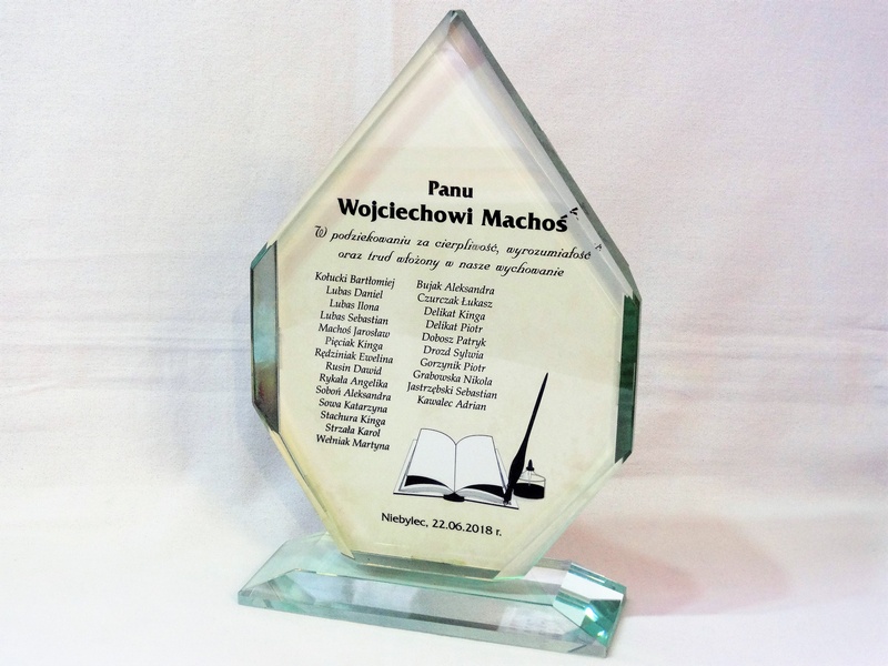 Pamiątkowa statuetka szklana G018 dla Nauczyciela z grubego szlifowanego szkła z nadrukiem dedykacji i ozdobnych grafik.