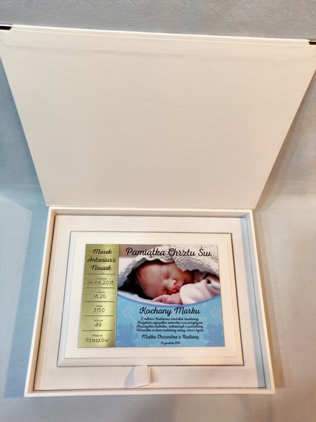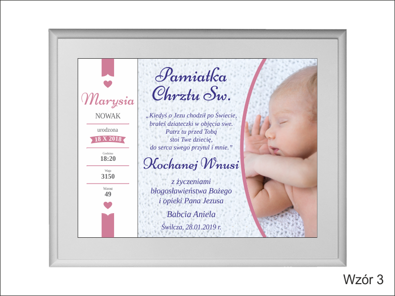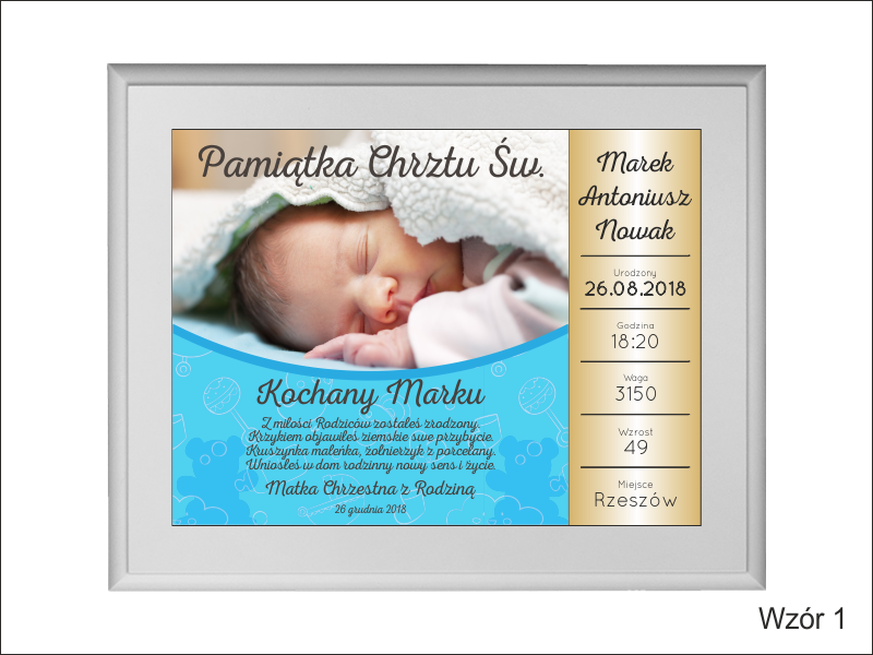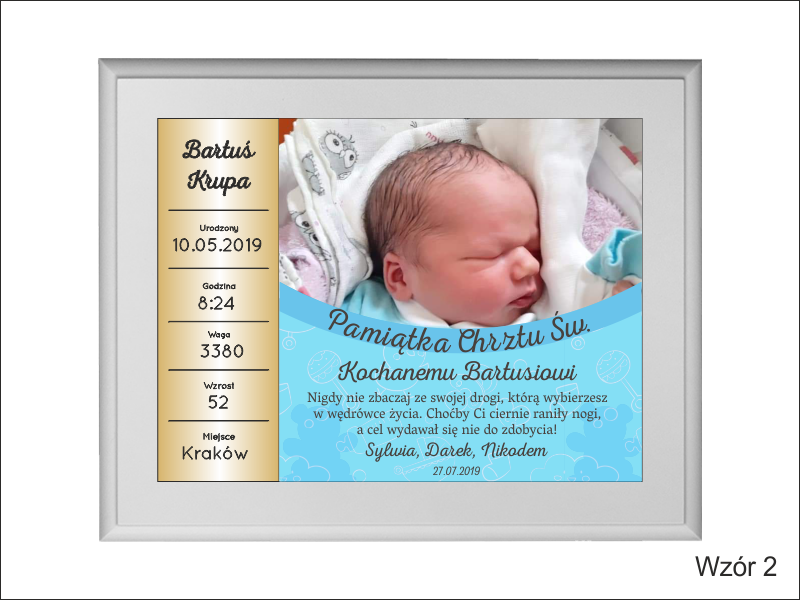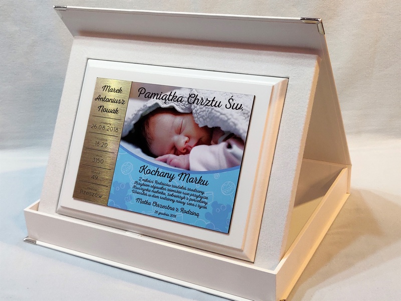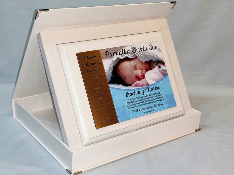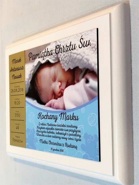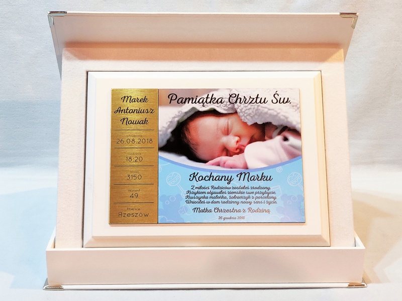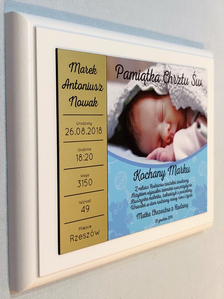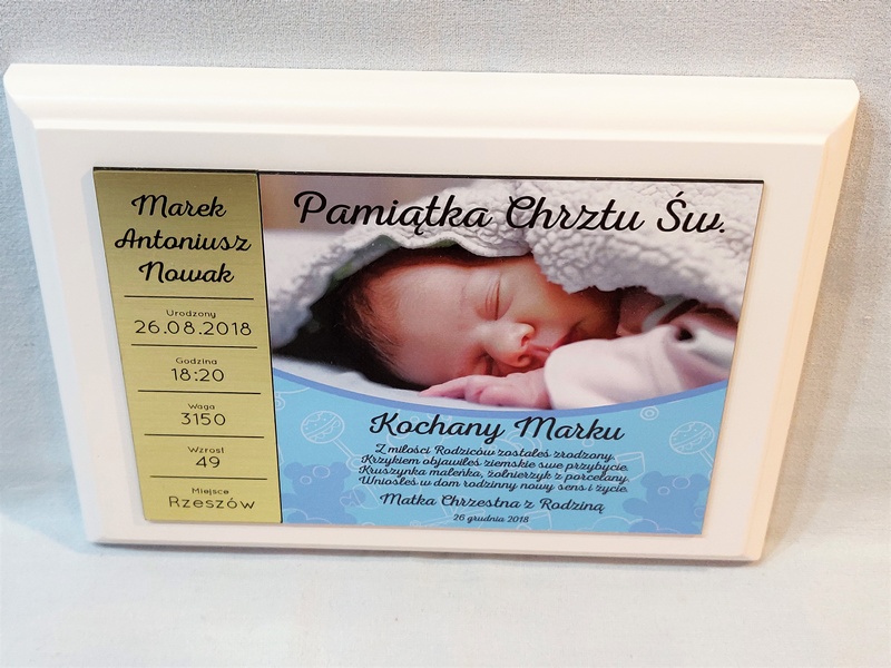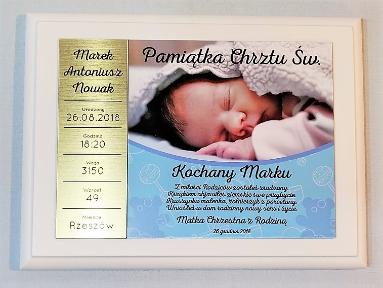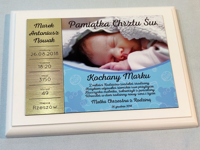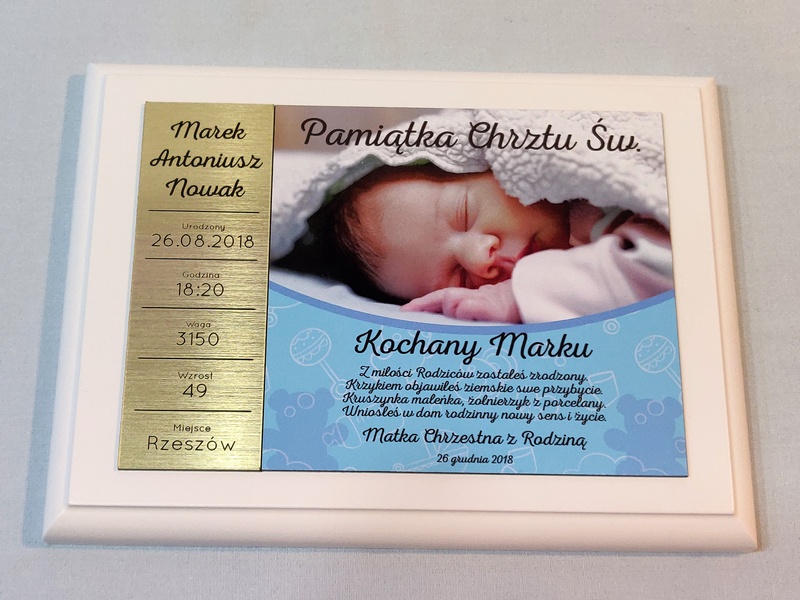 - z blachy lub laminatu z nadrukiem ozdobnego tła, dedykacji i zdjęcia dziecka