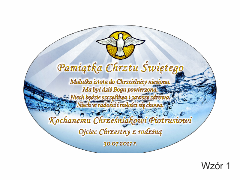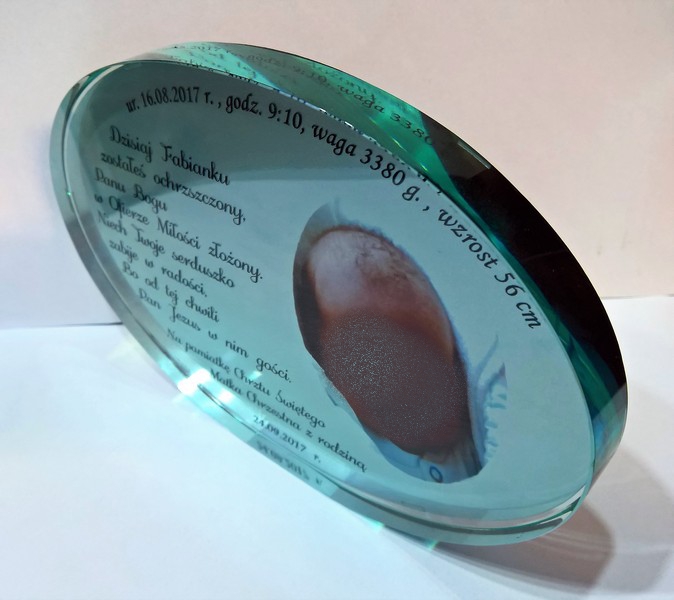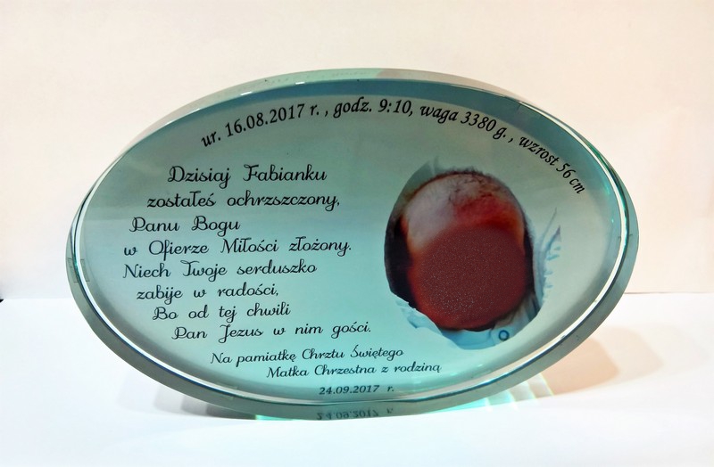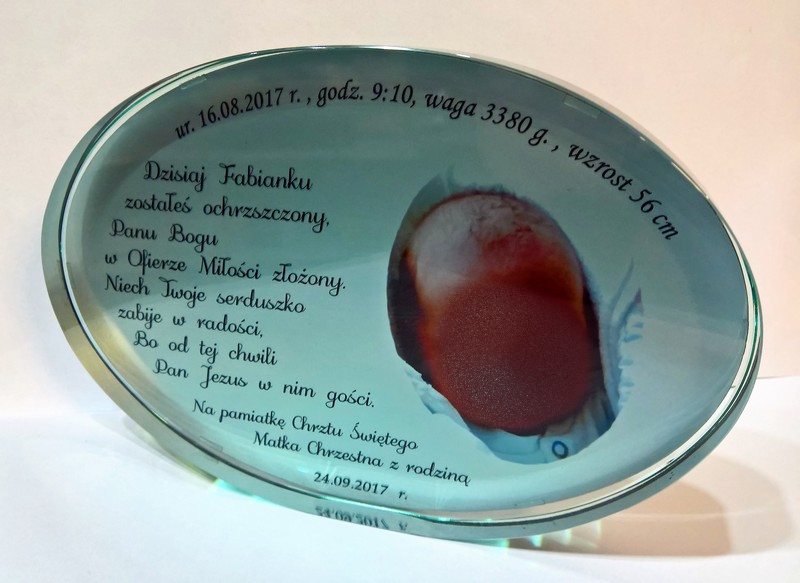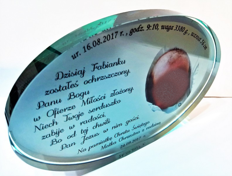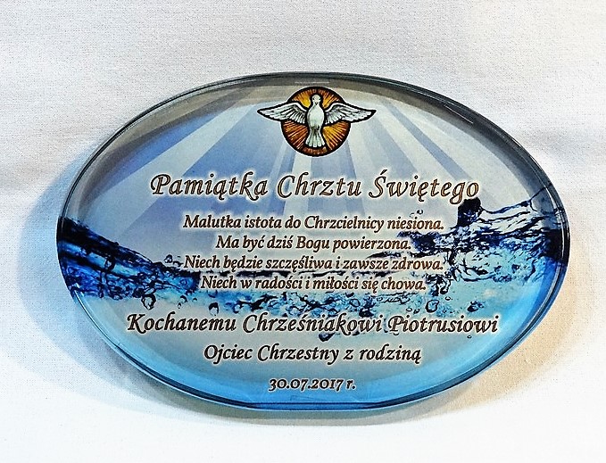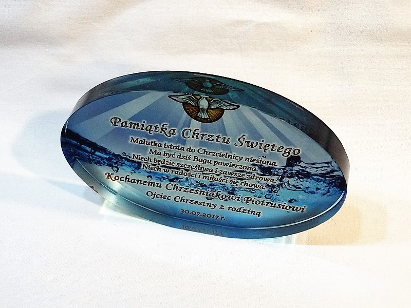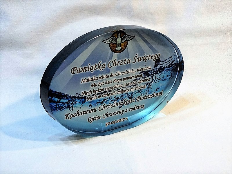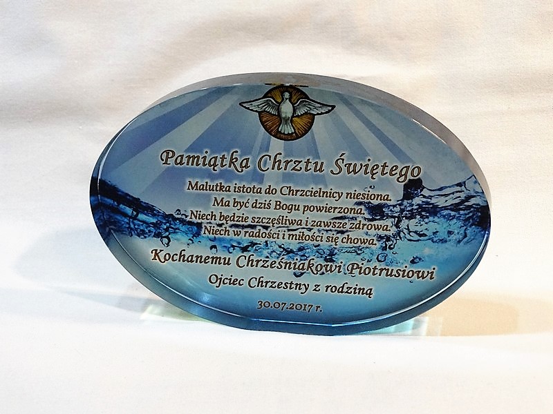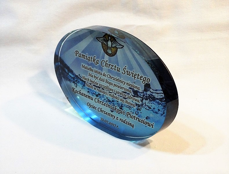 Statuetka szklana eliptyczna z grubego szkła z nadrukiem dedykacji i ozdobnych grafik z okazji Chrztu Świętego.