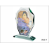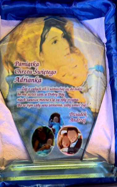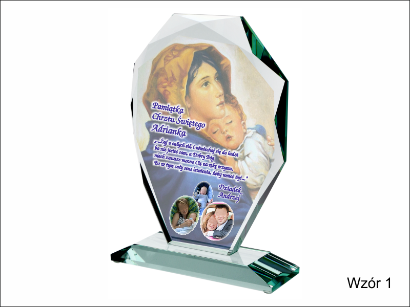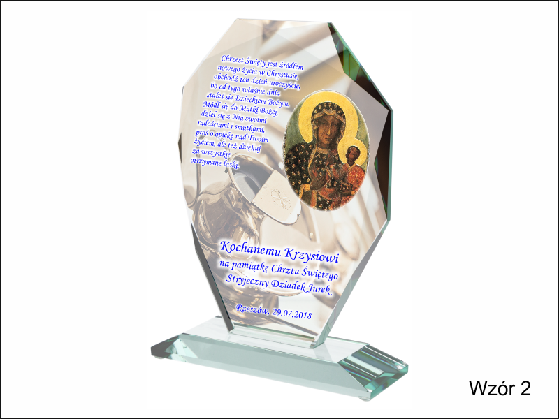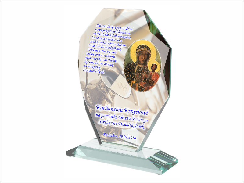 Statuetka szklana z grubego szkła w kształcie szlifowanego wyciągniętego ośmioboku z nadrukiem dedykacji i ozdobnych grafik z okazji Chrztu Świętego.