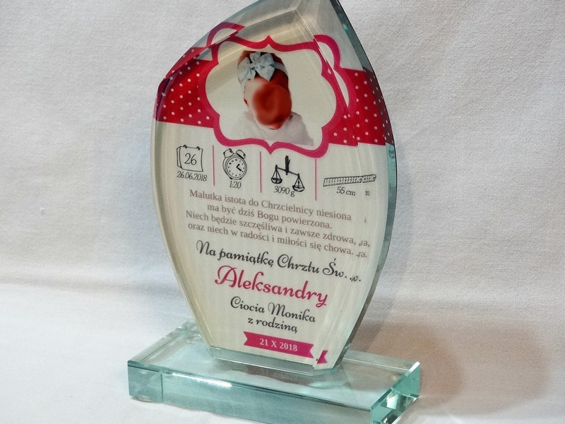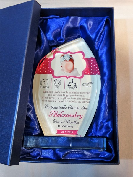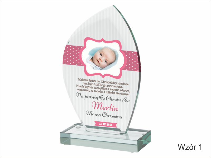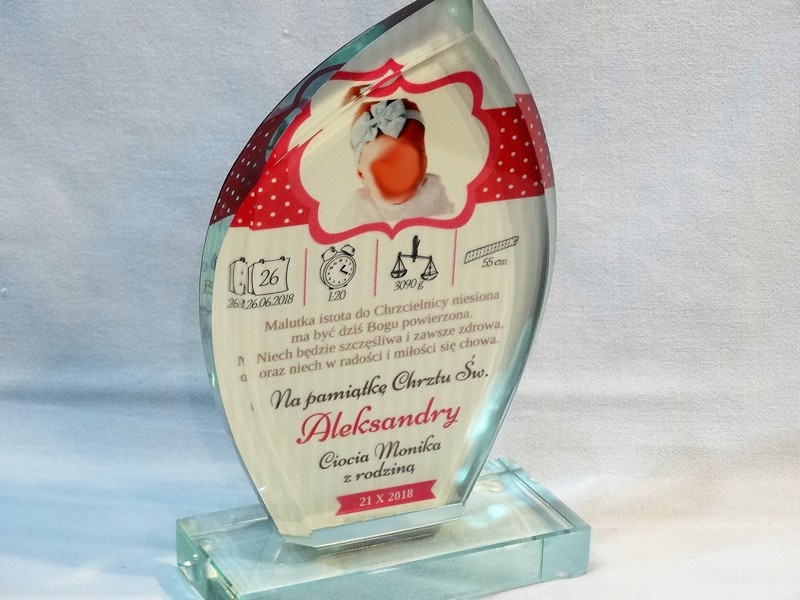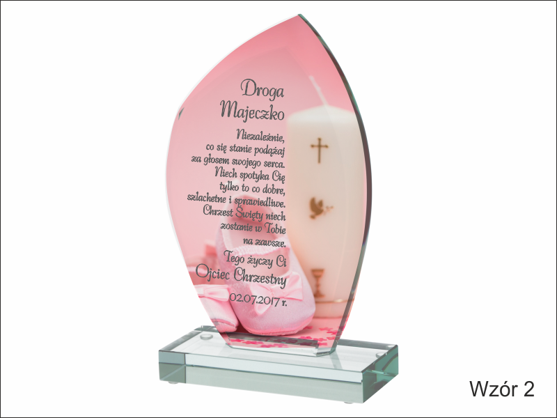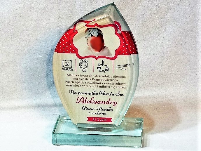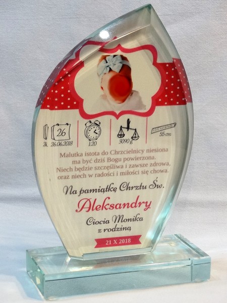 Statuetka szklana z grubego szkła w kształcie szlifowanego żagla z nadrukiem dedykacji i ozdobnych grafik z okazji Chrztu Świętego.